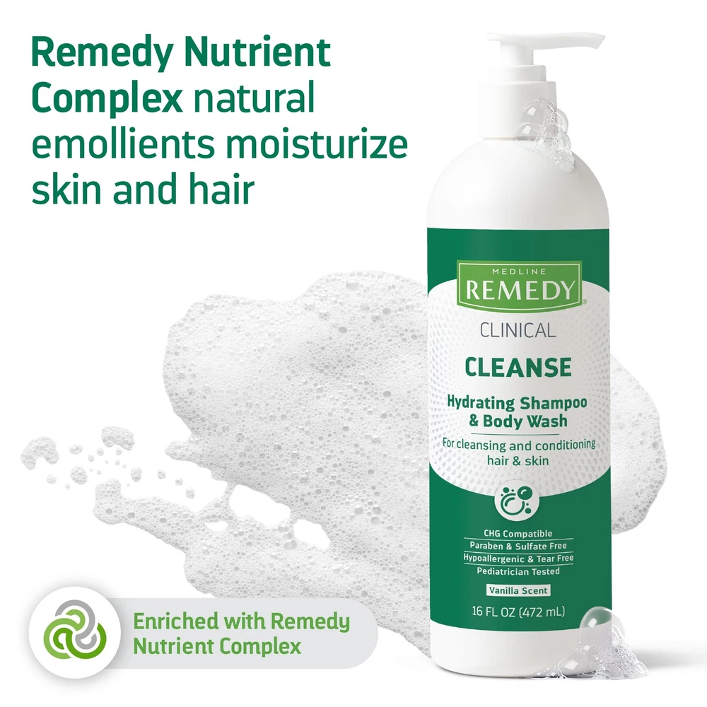Restore and nourish your skin with Remedy CLINICAL Hydrating Shampoo And Body Wash. Designed for incontinence care, but great for all ages from children to the elderly, the low-sudsing formula dissolves easily in water. Natural phospholipid cleansing agents cleanse soiled areas without removing skin's natural oils like harsh sulfate cleansers do. Use it as a shampoo and body wash to cleanse, condition and moisturize skin - without damaging hair. Like all Remedy CLINICAL cleansers, it’s pH balanced and hypoallergenic to help skin stay comfortable and maintain its delicate natural balance. Great for anyone who is bedridden or recovering from surgery, and anyone with difficulty accessing a bath or shower. It’s also a great alternative to dry shampoo. Just dilute with water, apply to hair and scalp, and towel dry hair. Formulated with the gentlest ingredients, it is paraben-free, sulfate-free, and tear-free - ideal for use on body, hair, face and perineal area. And because it’s designed for healthcare professionals who care for all types of patients, it is CHG compatible for an extra level of safety. Remedy CLINICAL products are designed by skin care experts and fortified with our proprietary Remedy Nutrient Complex. This blend includes nourishing botanicals, soothing antioxidants and natural oils, hydrators, moisturizers, emollients and humectants to deliver the finest all-around skin support. Easy to use anyway you like. Mix it 10:1 with water in a basin for bedside cleansing. Or use it right in your bath or shower to stay clean, fresh and odor free. It was designed specifically for incontinence care, so rest assured it can work to remove urine and fecal matter, as well as previously applied skin protectant barriers and pastes. And because it’s rinse-free, you can blot skin dry with a soft cloth or disposable wipe. Experience quality skin care that goes beyond the ordinary with Remedy Clinical No-Rinse Foam Cleanser - from the skin care experts at Medline. NO-RINSE, FULL BODY CLEANSER: Previously called Remedy Phytoplex Shampoo and Body Wash, this gentle gel uses special phospholipid cleansers, derived from coconut, to cleanse skin without removing natural oils VERSATILE: Use it in the bath or shower as a rinse-off, head-to-toe cleanser—or mix it 10:1 with water in a basin for bedside cleanups after incontinent episodes or for anyone with limited mobility NO HARSH INGREDIENTS: Tear-free formula with a light vanilla scent is good for all ages with no sulfates which dry out skin. Hypoallergenic, pH balanced, non-irritating, non-sensitizing; no parabens, aloe or phthalates ADVANCED SKIN SUPPORT: Contains moisturizing dimethicone and the Remedy Nutrient Complex (formerly Phytoplex) which provides extra skin nutrition, moisturization and antioxidants to soothe skin and maintain a healthy moisture balance PROVEN ON EXTREMELY DRY AND DAMAGED SKIN: Part of , healthcare’s #1 line of skin care. Trusted for use on the most delicate skin by leading hospitals and long-term care facilities nationwide