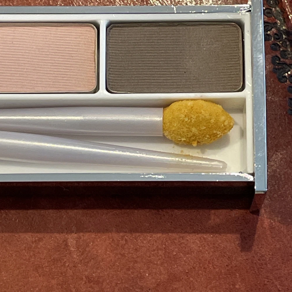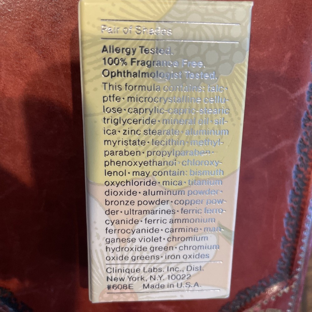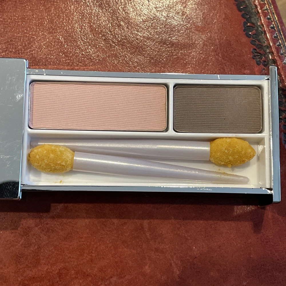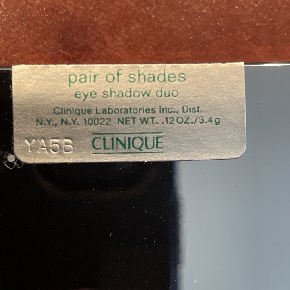 We have available for purchase a Clinique pair of shades eye shadow duo new in box. It has a net weight of .12 oz and 3.4g. It comes in the silver slide compact and you will need to replace applicators. There is no expiration date. This had a code of 608E-07. This is new old stock with possibly discontinued colors. Please ask all questions before purchasing items. Look carefully at photos as they are an important part of the description. We will provide free priority shipping on these items. Combined shipping is available, please wait for a combined invoice to be mailed to you. There are no returns on these items. Do no bid unless you agree with our terms.