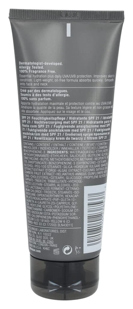 Clinique Skin Supplies for Men M Protect SPF 21 Daily Hydration + Protection 100ml/3.4oz Details Needed hydration plus daily UVA/UVB protection. Improves skin's condition. Lightweight, oil-free formula absorbs quickly. Lightweight, oil-free hydration plus daily UVA/UVB protection. All Skin Types How To Use Smooth onto face and neck, avoid immediate eye area. Ingredients Allergy Tested Ingredients: Water Aqua Eau, Ethylhexyl Methoxycinnamate, Ethylhexyl Salicylate, Butylene Glycol, Dimethicone, Butyl Methoxydibenzoylmethane, Neopentyl Glycol Diheptanoate, Benzophenone-3 (oxybenzone), Cetearyl Alcohol, Peg-100 Stearate, Silica, Hordeum Vulgare (barley) Extract Extrait D'orge, Algae Extract, Cucumis Sativus (cucumber) Fruit Extract, Helianthus Annuus (sunflower) Seedcake, Cholesterol, Cetearyl Glucoside, Propylene Glycol Dicaprate, Tridecyl Trimellitate, Hydrogenated Lecithin, Stearyl Alcohol, Zeolite, Lactobacillus Ferment, Cetrimonium Chloride, Tridecyl Stearate, Isododecane, Dipentaerythrityl Hexacaprylate/hexacaprate, Pvp, Oleth-10, Laureth-4, Laureth-23, Caprylyl Glycol, Hexylene Glycol, Polyethylene, Tromethamine, Carbomer, Sodium Citrate, Disodium Edta, Potassium Sorbate, Chlorphenesin, Phenoxyethanol, Yellow 5 (ci 19140), Yellow 6 (ci 15985), Red 33 (ci 17200) Please be aware that ingredient lists may change or vary from time to time. Please refer to the ingredient list on the product package you receive for the most up to date list of ingredients.
