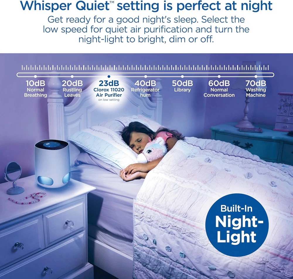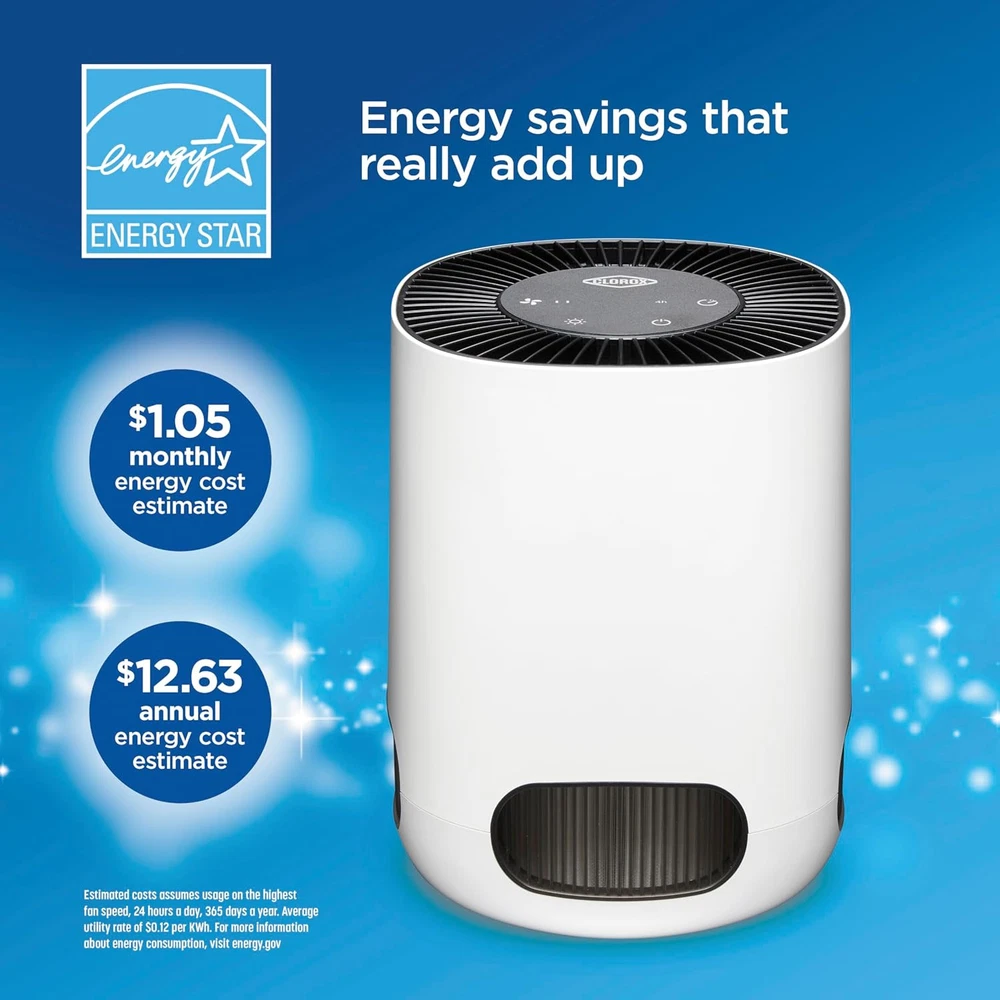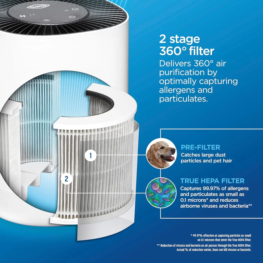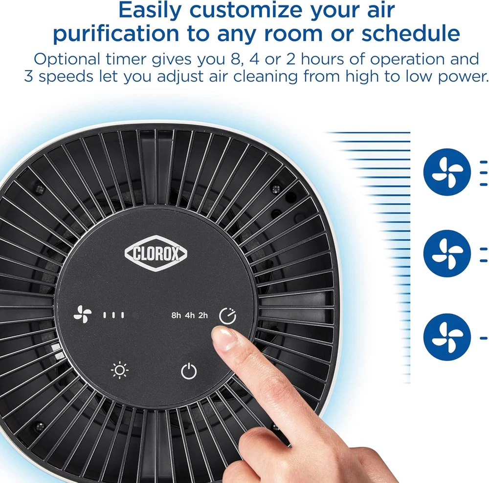 Clorox Air Purifiers for Bedroom Home, True HEPA Up to 200 Sq Ft, White Product Details Color: White Brand: Clorox Home Appliances Product Dimensions: 7.5"D x 7.5"W x 9.5"H Floor Area: 200 Square Feet Specification Met: EPA Certified Noise Level: 23 dB Particle Retention Size: 0.1 Micron Controller Type: Button Control Wattage: 12 watts Manufacturer: Clorox Home Appliances Item Weight: 3.08 pounds Item model number: 11020 Power SourceItem Weight: AC/DC1.4 Kilograms Control MethodFilter Type: TouchPre-Filter CAPTURES 99.97% OF ALLERGENS AND PARTICULATES AND REDUCES VIRUSES AND BACTERIA. The Clorox Tabletop Air Purifier has True HEPA filtration to capture 99.97% of particles as small as 0.1 microns and a pre filter to capture larger particles. 2 STAGE 360° FILTER: Delivers 360° air purification by capturing allergens and particulates in 2 filter layers. The outside pre filter catches large dust particles and pet hair and the True HEPA filter captures 99.97% of allergens and particulates. IDEAL FOR SMALLER ROOMS. This compact air cleaner is perfect for smaller rooms like the office, dorm, bedroom, den or nursery. The 360° filter pulls in air from all directions to clean rooms up to 5 times per hour when used in a room 80 sq. ft. and 2 times an hour when used in a room up to 200 sq. ft. EASILY CUSTOMIZE TO ANY ROOM OR SCHEDULE: This True HEPA air purifier has 3 speeds to let you customize air care to your needs. The optional timer lets you set air cleaning to your schedule simply choose from 8, 4 or 2 hours of operation. WHISPER QUIET SETTING IS PERFECT AT NIGHT. Get ready for a good night's sleep. Select the low speed for quiet air purification and turn the adjustable night light to bright, dim or off. GENUINE CLOROX FILTERS: Replace the filter every 6 12 months by searching for B09N54QY1R or Clorox 12020 Tabletop Replacement Filter. Maintain optimal performance with True HEPA filtration to capture 99.97% of particles as small as 0.1 microns and a pre filter to capture larger particles.at enter the True HEPA filter. 99.97% effective in capturing particles as small as 0.1 microns that enter the true HEPA filter. Reduction of viruses and bacteria as air passes through the true HEPA filter. Actual % of reduction varies. Does not kill viruses or bacteria. Cleaning effectiveness and filter life vary by air quality. Based on independent CADR testing, when operating on highest fan speed. Suggested room sizes assumes closed room with 8 ft. ceiling Estimated costs assumes usage on the highest fan speed, 24 hours a day, 365 days a year. Average utility rate of $0.12 per KWh. For more information about energy consumption, visit energy.gov Before first use remove Power Adapter from inside the filter. See Use and Care guide for more information. Testing performed by independent third party, LMS Technologies, INC, January 1, 2022 The Clorox™ Tabletop Air Purifier captures 99.97%* of particulates as small as 0.1 microns and reduces viruses and bacteria** so you can breathe easier. The 2 stage 360° filter captures particulates in a pre-filter and True HEPA filter. * Before first use remove Power Adapter from inside the filter. See Use and Care guide for more information.