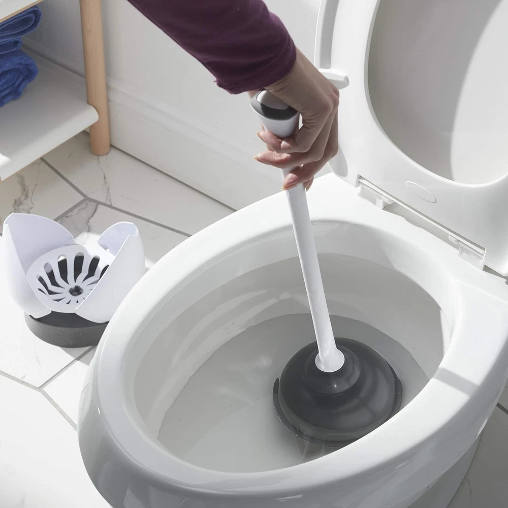 Clorox Toilet Plunger with Hideaway Caddy – 1-Pack, White/Grey Product Details Brand: CLOROX Color: White/Grey Handle Material: Plastic Specific Uses For Product: Toilet Product Dimensions: 6.5"L x 6.5"W x 16.5"H Material: Rubber Special Feature: Grip Handle Shape: Round Included Components: Caddy, Plunger Surface Recommendation: Floor Number of Items: 1 Theme: Cleaning Item Firmness Description: Medium Item Weight: 1 Pounds Manufacturer: Clorox Company Unit Count: 1.0 Count Item Weight: 1 pounds Country of Origin: China Item model number: 621225 Is Discontinued By Manufacturer: No Care instructions: Rinse clean Assembly required: No Number of pieces: 2 Batteries required: No TOILET PLUNGER WITH HOLDER SET: This toilet plunger set includes a coordinating hideaway caddy for convenient access and discreet storage in bathrooms when not in use. Perfect for tackling plumbing emergencies and keeping your space organized. HEAVY DUTY FLANGE CUP PLUNGER: Designed with a flange cup, this plunger for toilets creates a seal to exert maximum pressure and clear even the toughest clogs quickly. DISCREET HIDEAWAY CADDY: The storage caddy automatically opens when the plunger is removed and closes when it is placed inside. Your plunger will dry more efficiently with the internal drip tray that will help keep your floors clean and more sanitary. ERGONOMIC GRIP: The 15.5-inch handle features an ergonomic, comfortable grip that provides additional leverage for highly effective results when unclogging the toilet. EFFICIENT SIZING: This hideaway caddy measures 6.5 inches x 6.5 inches x 16.5 inches total with a rubber base to prevent the storage caddy from tipping or sliding, making it ideal for storing next to the toilet. Keep your bathroom clean and clutter-free with the Clorox Toilet Plunger with Hideaway Storage Caddy, a convenient and discreet solution for toilet cleaning. This convenient everyday toilet plunger set includes a heavy-duty plunger and a coordinating plunger storage caddy for easy access and mess-free storage when not in use, making it perfect for any home or business. Designed with a flanged cup, the plunger effectively clears even the toughest clogs in all toilets, including low-flow models. The 15.5-inch ergonomic handle provides added leverage for powerful plunging and comfortable use. The automatic hideaway caddy features a clamshell-style lid that opens when the plunger is removed and closes after use for clean, simple, and discreet storage. It includes an internal drip tray that helps the plunger dry quickly, preventing spills and keeping your bathroom floors clean. The non-slip rubber base ensures the caddy stays stable and secure. Compact and freestanding, this plunger with storage caddy measures 6.5" x 6.5" x 16.5", making it the perfect fit next to any toilet.