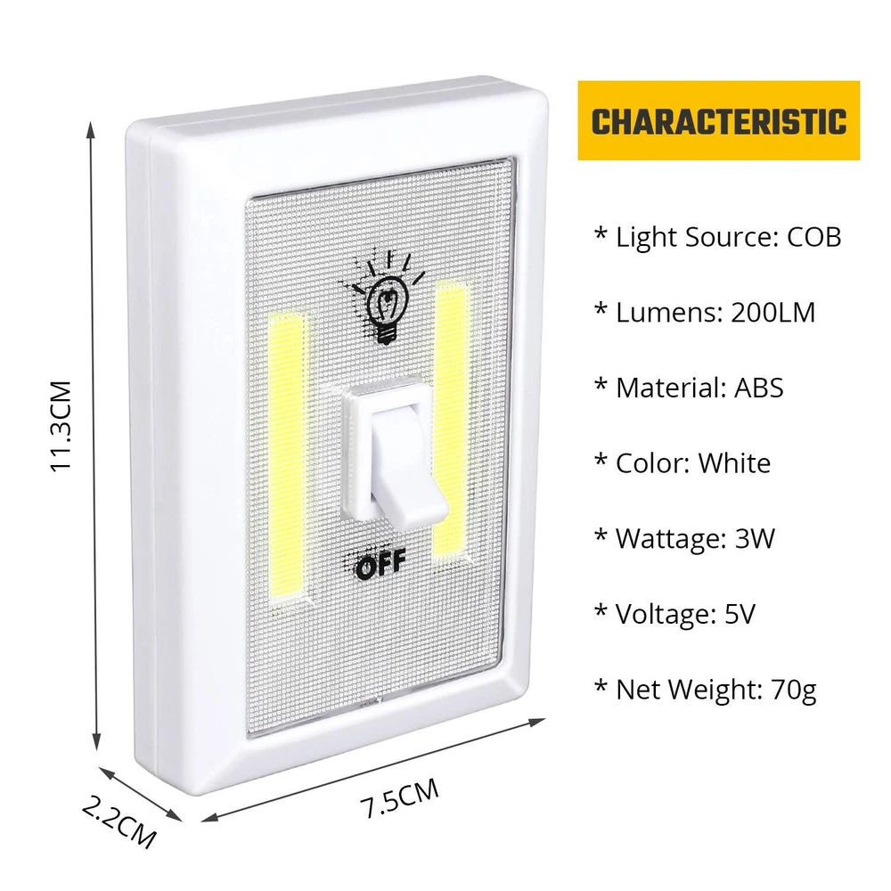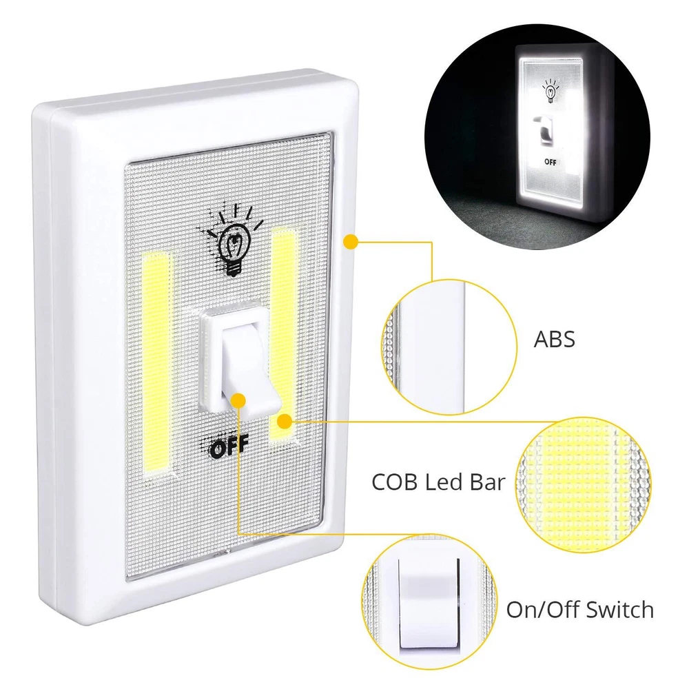 Ideal Bright: Led switch night light with good led strips. perfectly lighting up the dark place, keep our surrounding can see clearly, such as the utility rooms, cabinet/cupboard/closet, outdoor shed, garage, truck Easy to Use: One classic switch controls its power, turn on/off anytime. Great to have one on hand for emergencies, like power outage, fix things outdoors at night Easy Installation: The stick on light can stick anywhere by adhesive set. Also suck to metal items by magnet Battery Operated Night Light: The stick on closet lights is powered by 3*AAA batteries(not included). No electricity problem, safe What You Get: 4 pcs of closet lights battery operated, 1 set of adhesive hook, 1 manual
