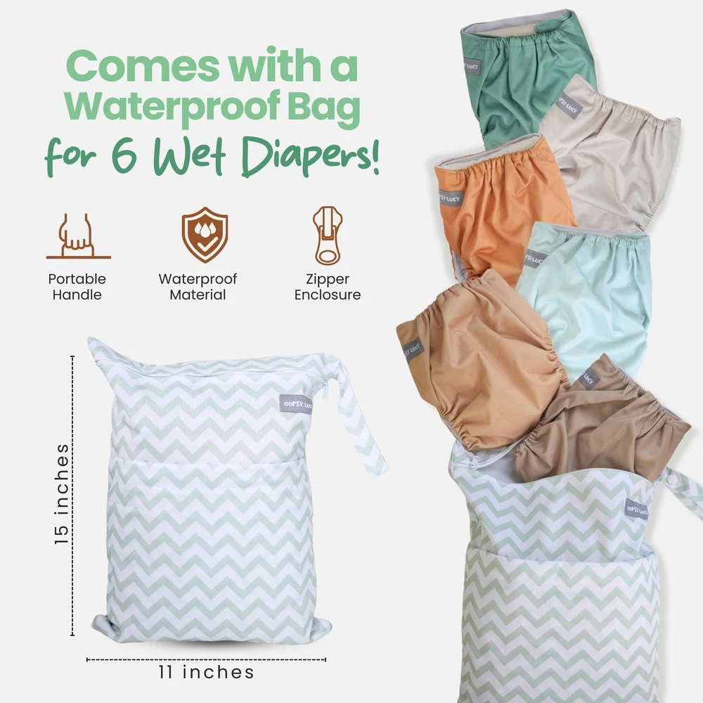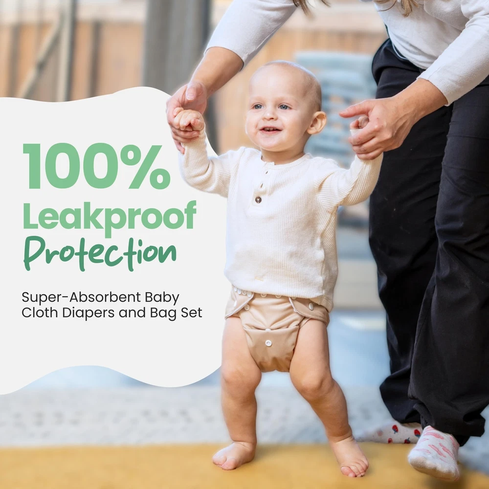 This set of cloth diapers include: 6 pockets cloth diapers, 6 inserts and 1 wet bag. The inner of the cloth diaper is Suede cloth and the out side of the pocket is PUL. The inserts are 55 % polyester, 30 % Baboo fiber and 15% cotton. All-in-One Set – Diapering Made Simple Includes 6 reusable cloth diapers, 6 ultra-absorbent inserts, and a waterproof wet bag. Ideal for everyday use and perfect for families on the go. One Size Fits All – Adjustable From 10–33 lbs Thoughtfully designed with durable snap closures for a secure, comfy fit from baby to toddler. Grow-with-me diapers that adapt to your child’s needs. Day & Night Protection – Gentle and Leakproof Soft inner lining and waterproof outer shell keep your baby dry around the clock. Breathable, rash-friendly design perfect for both daytime play and overnight sleep. Hassle-Free Washing – Machine Washable & Quick to Dry Made for real-life parenting: our diapers go straight into the wash and dry quickly, so you can spend less time on laundry and more time with your little one. Eco-Friendly & Budget-Smart – Save Over $1,000 Switching to cloth diapers helps reduce landfill waste and diapering costs. It's a small choice that makes a big difference—for your baby, your wallet, and the planet.