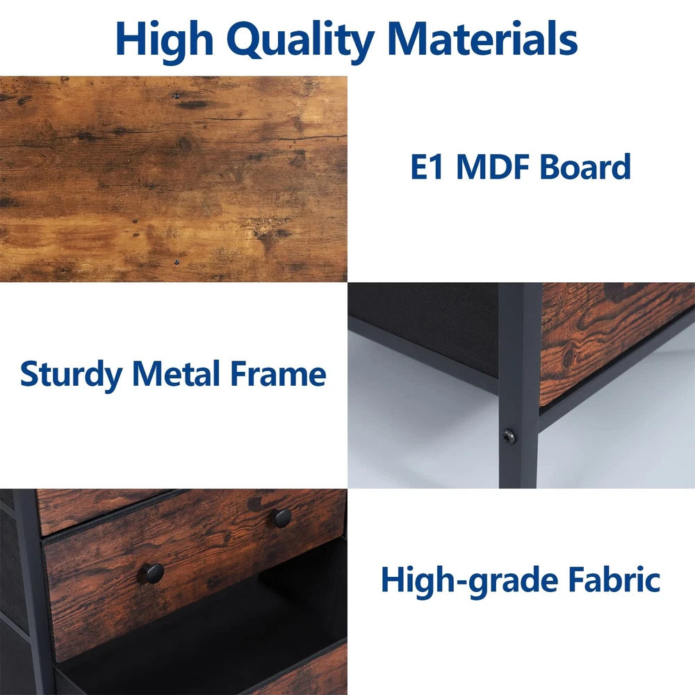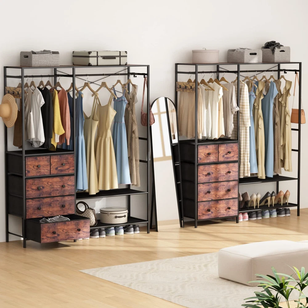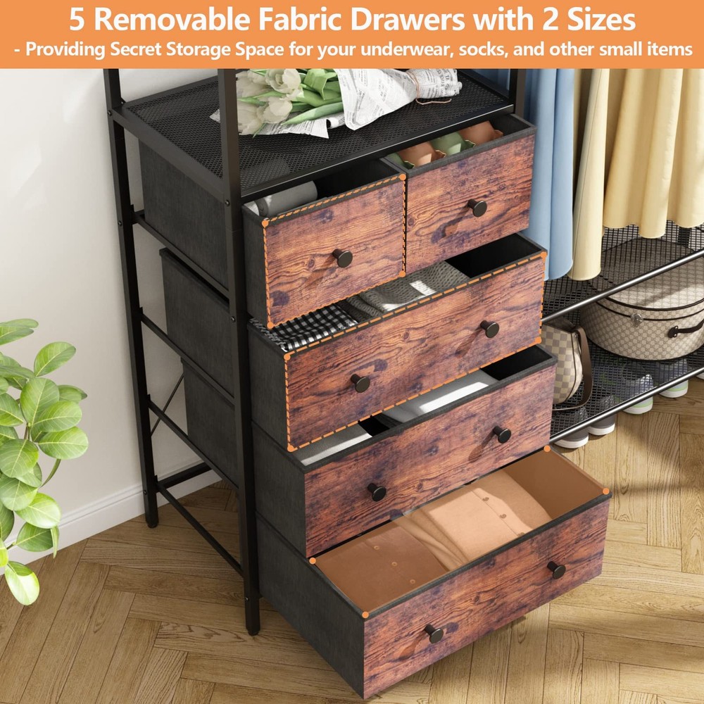 šćAmple Storage SpacećIs your closet too messy? Get this portable, freestanding clothes rack to help you organize your clothes, shoes, bags, storage boxes, hats, and other items. It features five removable fabric drawers, four storage shelves, two hanging rods, and five hooks to meet your storage needs. Each area has enough storage space to accommodate different items, so you can easily find them without searching everywhere. It can store many items but only takes up a small part of the room. šćSturdy and DurablećAre you worried that the rack won't be able to bear the weight of your items? This heavy-duty metal closet storage organizer system is made of a sturdy metal frame, high-quality MDF board, and high-grade non-woven fabric. Thanks to these materials and stable construction design, this closet rack is sturdy and durable. Two X-shaped support rods are added to the back to ensure stability. And the anti-tipping kits and adjustable non-slip footpads improve its safety. šćA Perfect ChoicećAre you concerned that your room is too small? This clothing rack features a freestanding design for added portability and its compact design only occupies a small ground surface. At the same time, it offers you a super sturdy and stable option and maximizes the space to place your clothes, shoes, handbags, and luggage. It is suitable for cloakrooms, apartments, dressing rooms, laundry rooms, etc. It's a perfect choice for tidying up your messy room! šćMinimalist Industrial StylećAre you worried that the style won't match your room? This multifunctional garment rack combines functionality and fashion design. It features a matte black frame, a rustic brown finish, and a unique design style, making it eye-catching. It can effortlessly transform your storage space into an industrial style, and it perfectly matches your room. šćEasy Assembly and Buy with ConfidencećAre you worried that the installation process is too complicated? This wardrobe closet includes all parts, hardware, and clear installation instructions. All parts have corresponding labels, and the installation steps are described in detail, so you can easily install the closet rack. We provide friendly customer service, and if you have any problems, please feel free to contact us, and we will reply to you within 24 hours. Buy with confidence!