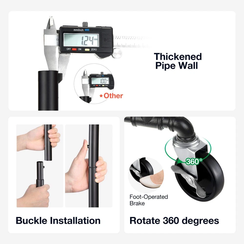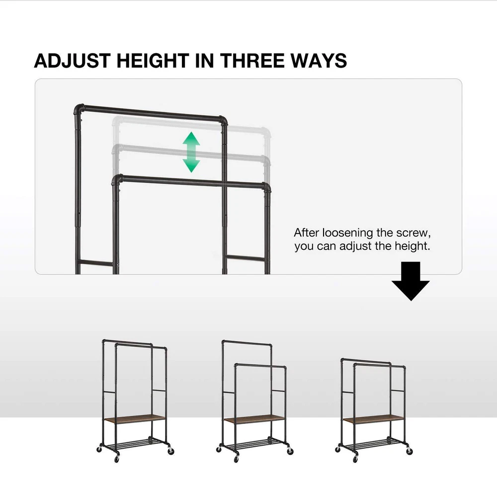 Sturdy and Heavy Duty Garment Rack: Made of premium iron tubes with 1.55mm thickness, ensure superior strength and stability. Made of 1.5 cm thickness composite wood. Waterproof and wear-resistant. It is definitely strong and stable for long years to use. Chic Industrial Style: The perfect combination of industrial style and country style adds a low-key yet luxurious atmosphere to your home decoration. You can put it in your bedroom, living room, laundry room and boutique.It perfectly matches your home decoration. It attracts your attention to find your clothes and make your life more convenient. Easy to Install: 4 omnidirectional wheels (2 with locking brake) can be rotated 360 degrees, with integrated design, reducing the cumbersome steps of installation, can be assembled without any tools, we have provided detailed instructions for easy installation. Adjustable Height: The double pole drying rack can be adjusted by turning the screws to achieve the three states of the shelf. The four metal tubes side by side can store shoes or storage boxes, and the two lateral bars on the side can be used to hang clothes, which can meet any need of hanging clothes. Large storage capacity & Multi-functional Storage: Maximum weight capacity is 400 lbs. Two steel pipes can store a lot of winter clothes. There is also a middle panel and a steel pipe layer on the ground, which can store other accessories for daily wear, bags, scarves, shoes, etc. All items used for daily wear can be easily and neatly stored through this multi-functional clothes rack.