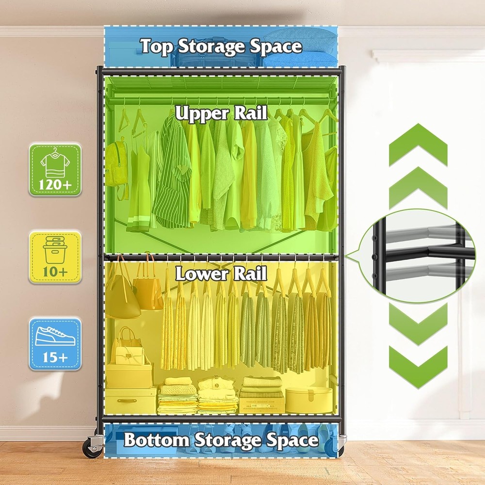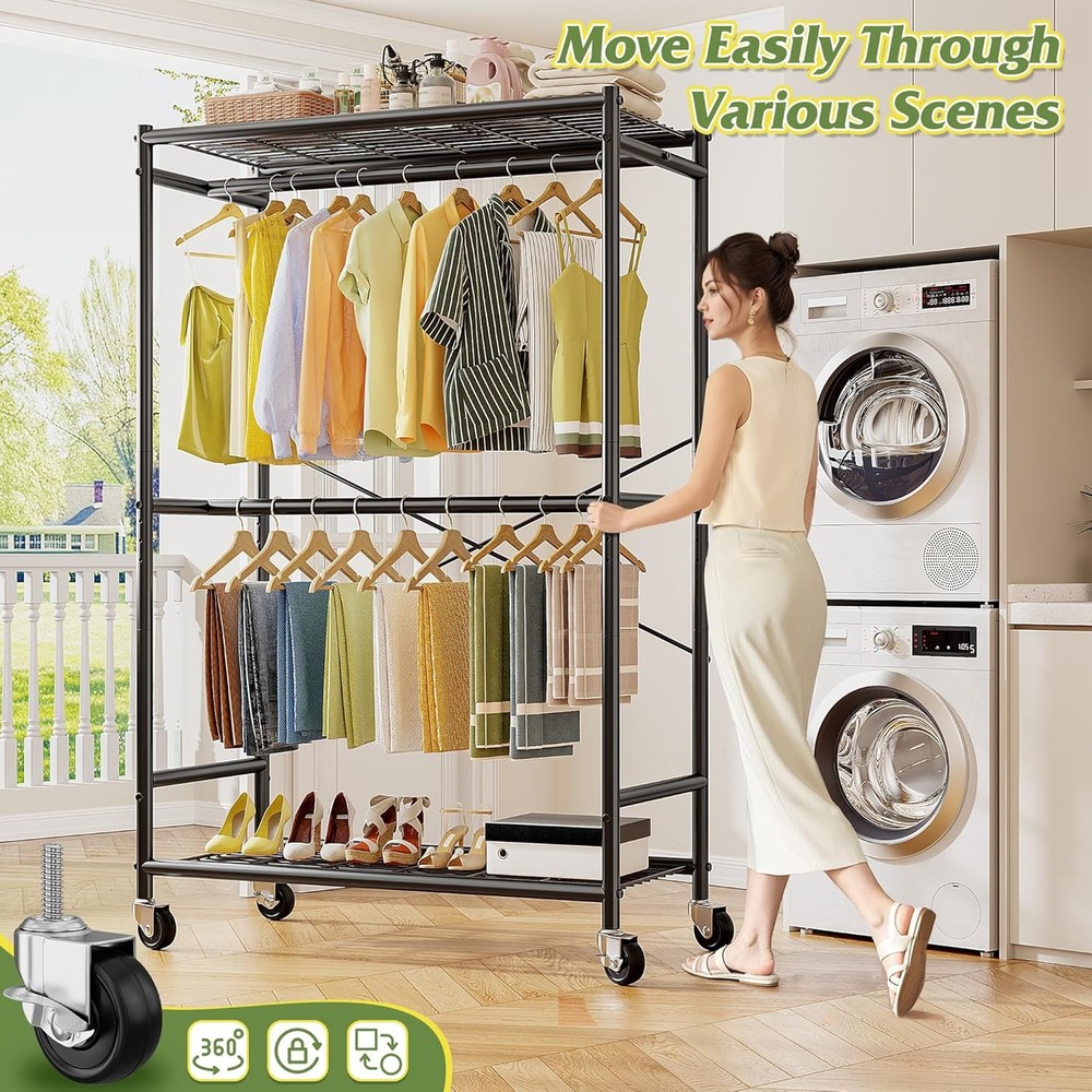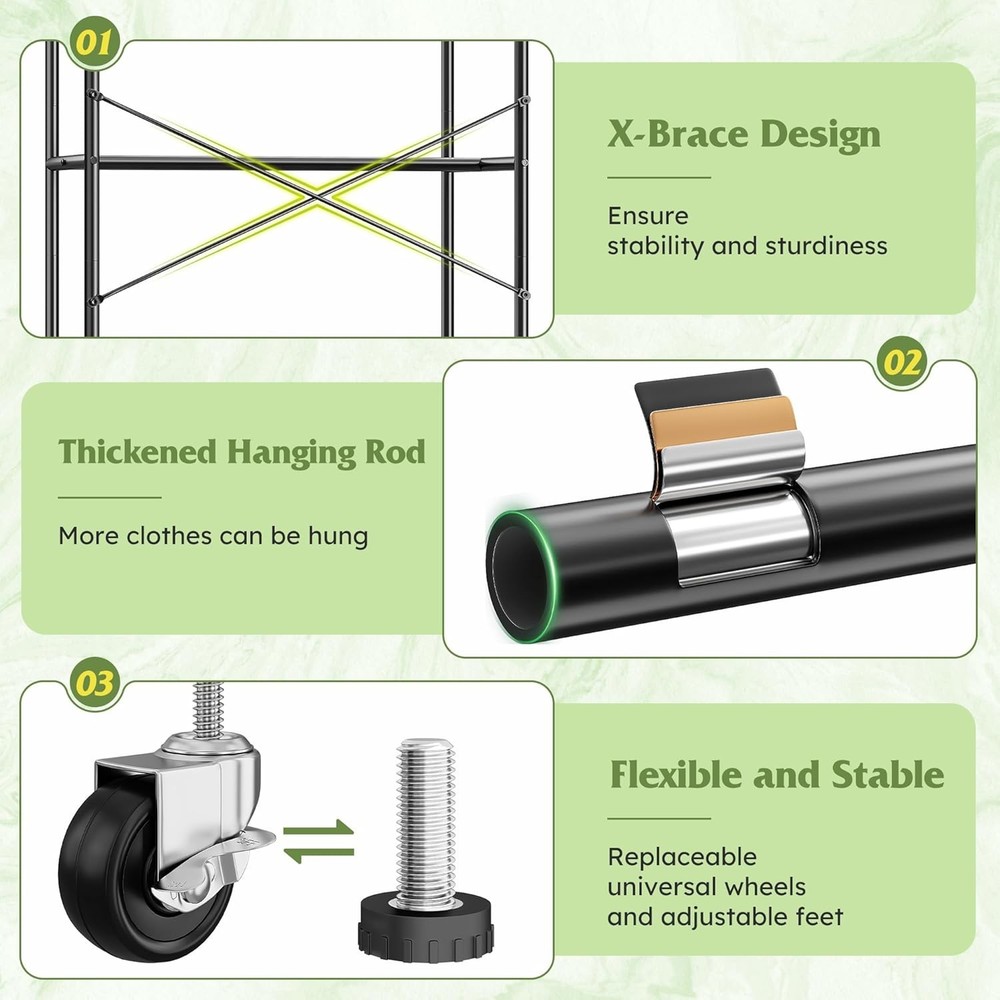 Product Description Heavy Duty Clothes Rack with Wheels Stylish Clothing Rack for Hanging Clothes with Multiple Functions Sturdy and Durable Garment Rack Additional storage space Precise Pre-punching X-Brace More Stable Heavy-duty poles Clothes Racks for Every Occasion On Aug 6, 2025 at 20:32:17 PDT, seller added the following information: