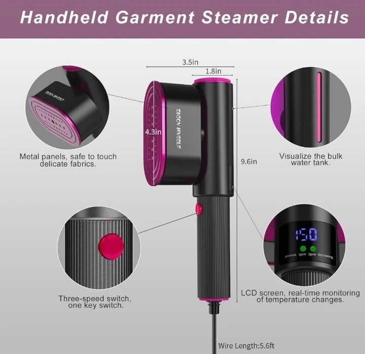 Whats Included: Contains a hand-held garment steamer suitable for 100-120V voltage, a silicone hot pad, a storage bag and a measuring cup, and also a lint roller with three replacement rollers 3-In-1 Ironing Modes: With three ironing modes, the garment steamer combines traditional ironing with steaming. Use low steam for small creases, high steam for large creases, or dry ironing for stubborn wrinkles. The switch with indicator light allows for easy adjustments Effortless Wrinkle Removal: Our powerful hand-held steamer heats up in just 30 seconds to 302°F with 1200W power and 15g/min steam volume. The upgraded metal panel ensures stable and powerful steam output, making it easy to remove wrinkles from clothes Leak-Proof and Spill-Proof: With our latest leak-proof technology, you can use steam easily at any angle without worrying about water spilling and damaging your clothes. The LCD screen monitors temperature changes in real-time Portable and Versatile: Our 90° rotatable head and steam output that glides evenly on delicate fabrics make it simple to achieve wrinkle-free clothes. Its lightweight and compact design make it easy to store and carry, perfect for home use and travel