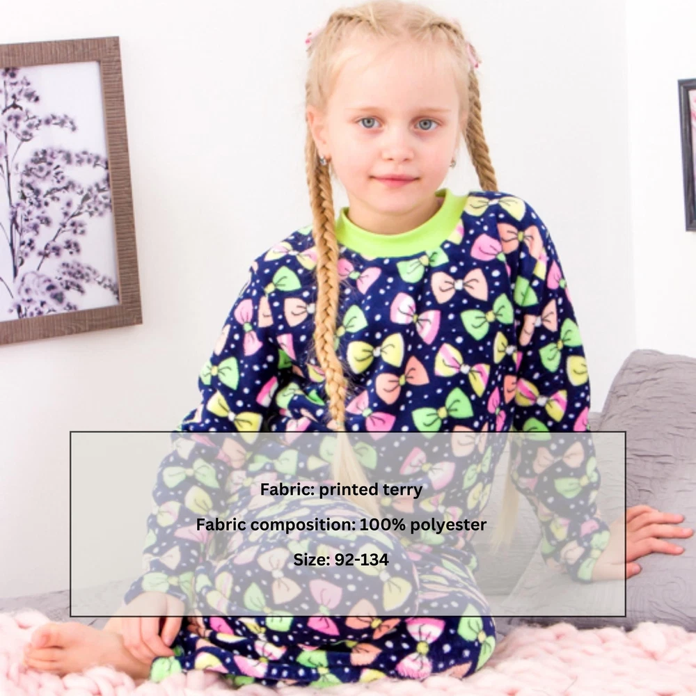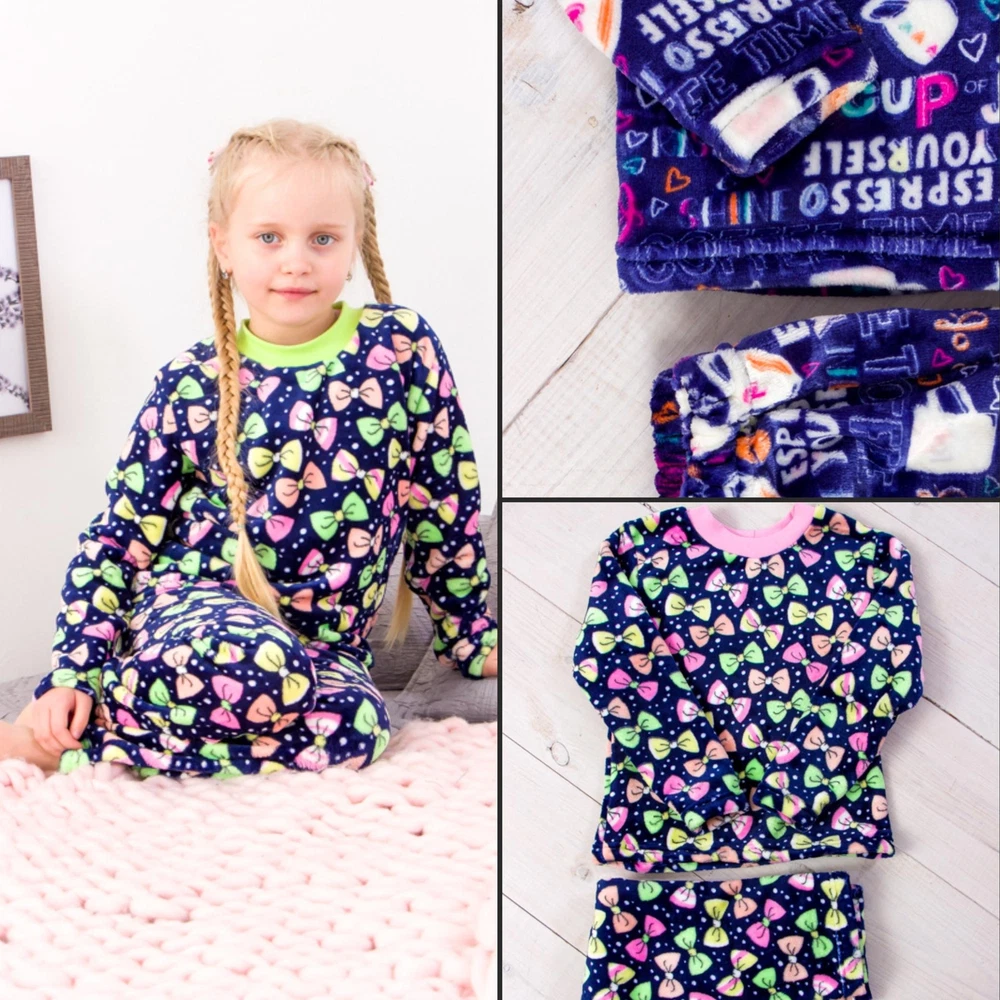 Material: Wellsoft General size: 92-134 Seazon:Winter Pattern:Graphic Print Clothing decoration:no decoration Size: 92, Bust: 64cm, Top Length: 38cm, Sleeve Length: 33cm, Hips: 64cm, Pant length: 54cm, Height: 92cm Size: 98, Bust: 66cm, Top Length: 39cm, Sleeve Length: 35cm, Hips: 68cm, Pant length: 60cm, Height: 98cm Size: 104, Bust: 68cm, Top Length: 42cm, Sleeve Length: 37cm, Hips: 70cm, Pant length: 64cm, Height: 104cm Size: 110, Bust: 70cm, Top Length: 44cm, Sleeve Length: 40cm, Hips: 74cm, Pant length: 69cm, Height: 110cm Size: 116, Bust: 74cm, Top Length: 46cm, Sleeve Length: 41cm, Hips: 76cm, Pant length: 74cm, Height: 116cm Size: 122, Bust: 78cm, Top Length: 47cm, Sleeve Length: 43cm, Hips: 80cm, Pant length: 76cm, Height: 122cm Size: 128, Bust: 80cm, Top Length: 49cm, Sleeve Length: 45cm, Hips: 84cm, Pant length: 80cm, Height: 128cm Size: 134, Bust: 82cm, Top Length: 51cm, Sleeve Length: 47cm, Hips: 86cm, Pant length: 85cm, Height: 134cm Provide your little princess with the warmest and coziest sleep with our gorgeous warm pajamas for girls. Our kids' pajamas are made using the best warm materials to guarantee comfort and keep her warm even on the coldest days. A variety of designs and colors will help you choose the perfect pajamas for your little fashionista. You will be able to find the perfect fit and make winter nights even warmer and more unforgettable. Choose the best warm pajamas for your daughter and give her comfort and joy every night.