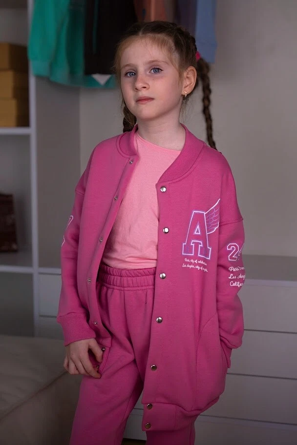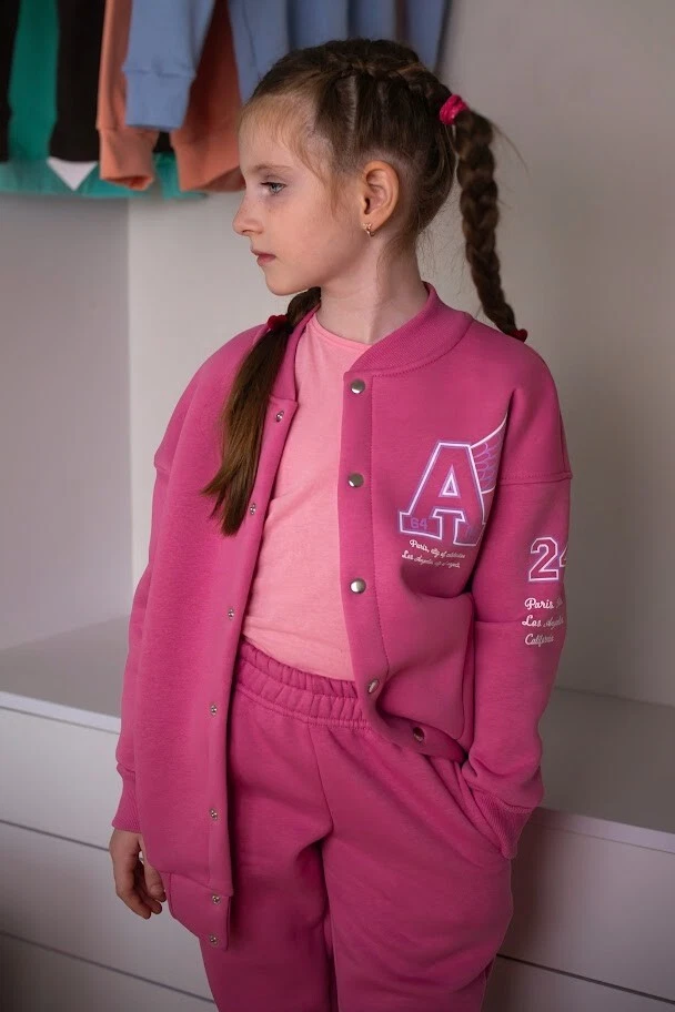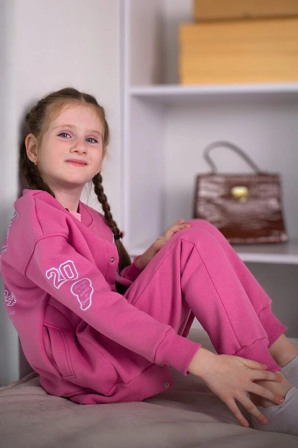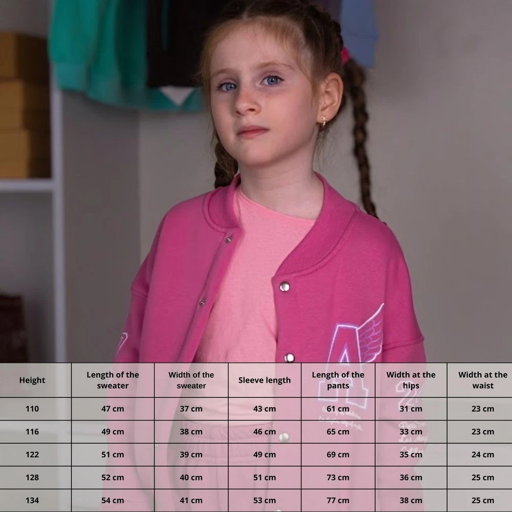 Material: Jersey General size: 110-134 Seazon:Winter Pattern:Graphic Print Clothing decoration:no decoration Size: 110, Bust: 76cm, Top Length: 47cm, Sleeve Length: 45cm, Hips: 62cm, Pant length: 61cm, Waist: 48cm, Height: 110cm, Shoulder: 38cm Size: 116, Bust: 78cm, Top Length: 49cm, Sleeve Length: 47cm, Hips: 66cm, Pant length: 65cm, Waist: 50cm, Height: 116cm, Shoulder: 39cm Size: 122, Bust: 80cm, Top Length: 51cm, Sleeve Length: 51cm, Hips: 70cm, Pant length: 69cm, Waist: 50cm, Height: 122cm, Shoulder: 40cm Size: 128, Bust: 82cm, Top Length: 53cm, Sleeve Length: 54cm, Hips: 74cm, Pant length: 73cm, Waist: 52cm, Height: 128cm, Shoulder: 41cm Size: 134, Bust: 84cm, Top Length: 55cm, Sleeve Length: 46cm, Hips: 78cm, Pant length: 76cm, Waist: 52cm, Height: 134cm, Shoulder: 42cm A stylish suit for girls is the perfect choice for everyday wear or special occasions. The set consists of an elegant top and comfortable pants, made from high-quality materials that provide comfort and ease of movement. The fashionable design highlights individuality, while the soft fabric feels pleasant to the touch. This suit is suitable for school and outings. It easily matches other wardrobe items. Practicality and durability make it an excellent choice for any girl.