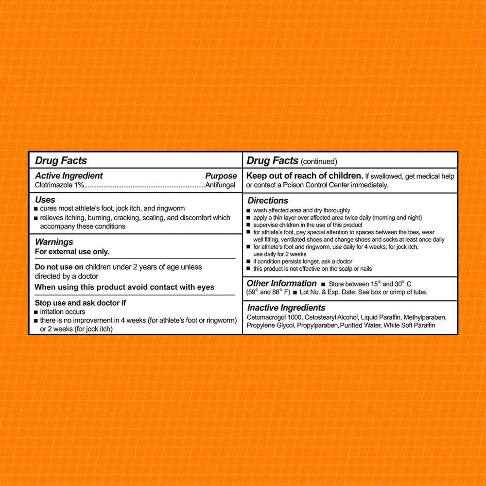 COMPARE TO the Active Ingredient of Leading Brand. Contains Active Ingredient: Clotrimazole 1% EFFECTIVE TREATMENT and cures most athlete’s foot (tinea pedis), jock itch (tinea cruris), ringworm (tinea corporis). Also Effective in the Prevention of Athlete’s Foot. SOOTHES AND RELIEVES itching associated with jock itch, scaly skin between the toes and burning feet. This odorless and soothing first aid cream treatment goes on smoothly even in hard-to-reach areas. TAMPER PROOF each 1oz Tube has a tamper evident foil safety seal. FDA REGISTERED with NDC# (National Drug Code Number) printed on packaging with LOT # and Expiration Date. For External Use Only. Product Description