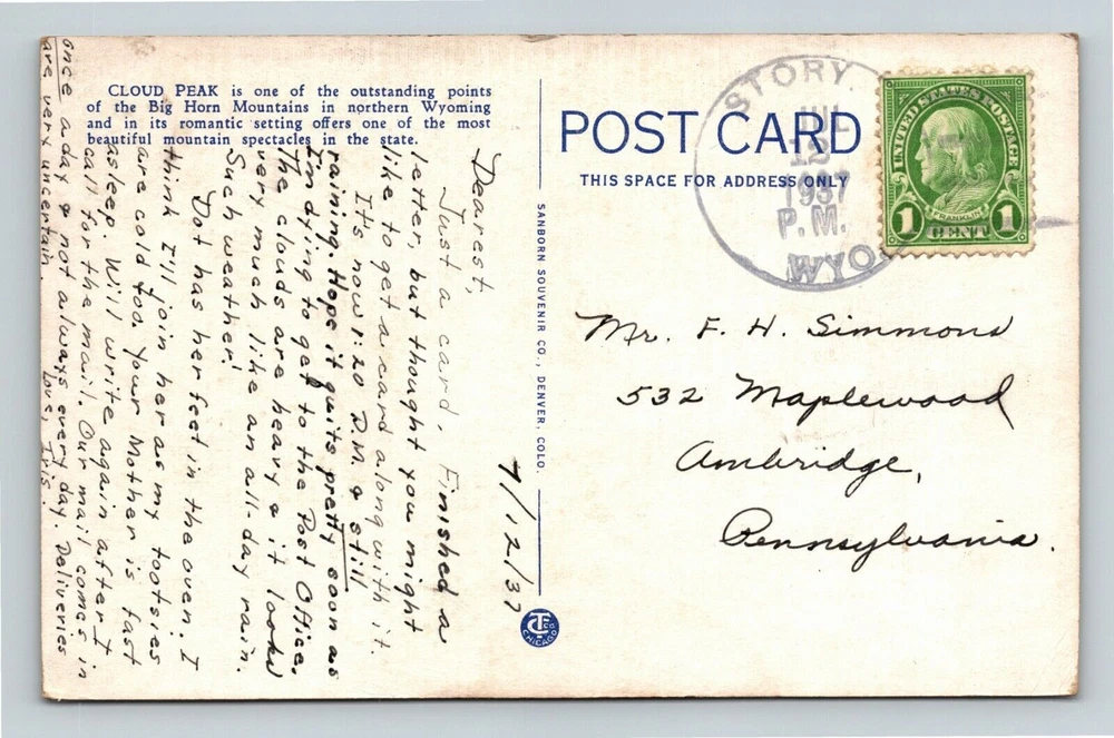 Unit of Sale: Single Unit Country/Region of Manufacture: Unknown Type: Printed (Lithograph) Theme: Cities & Towns Era: See Postcard Scan Circulated: Yes City/Region: Big Horn Mountains Subject: See Postcard Scan Original/Licensed Reprint: Original City: See Postcard Scan Continent: North America Region: See Postcard Scan Country: See Postcard Scan Postage Condition: Posted