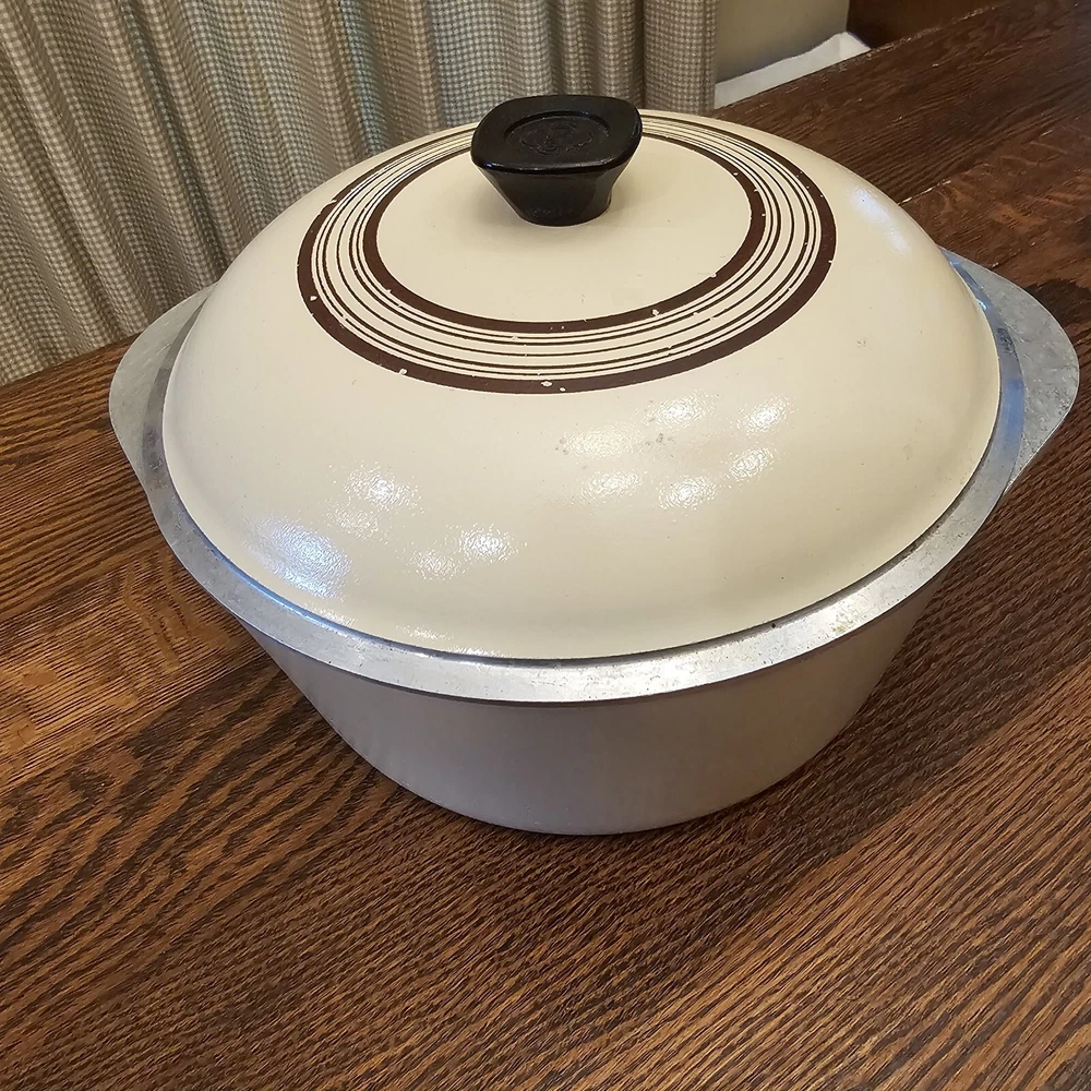 This CLUB Nonstick pot is in good used condition. A few scratches on the inside. Some wear on the lid paint. Outside bottom stained from use. 10" diameter. The pot stand 4 1/8" tall. To the top of the lid handle it measures ~7" tall. Overall in nice used condition. 4 quart.