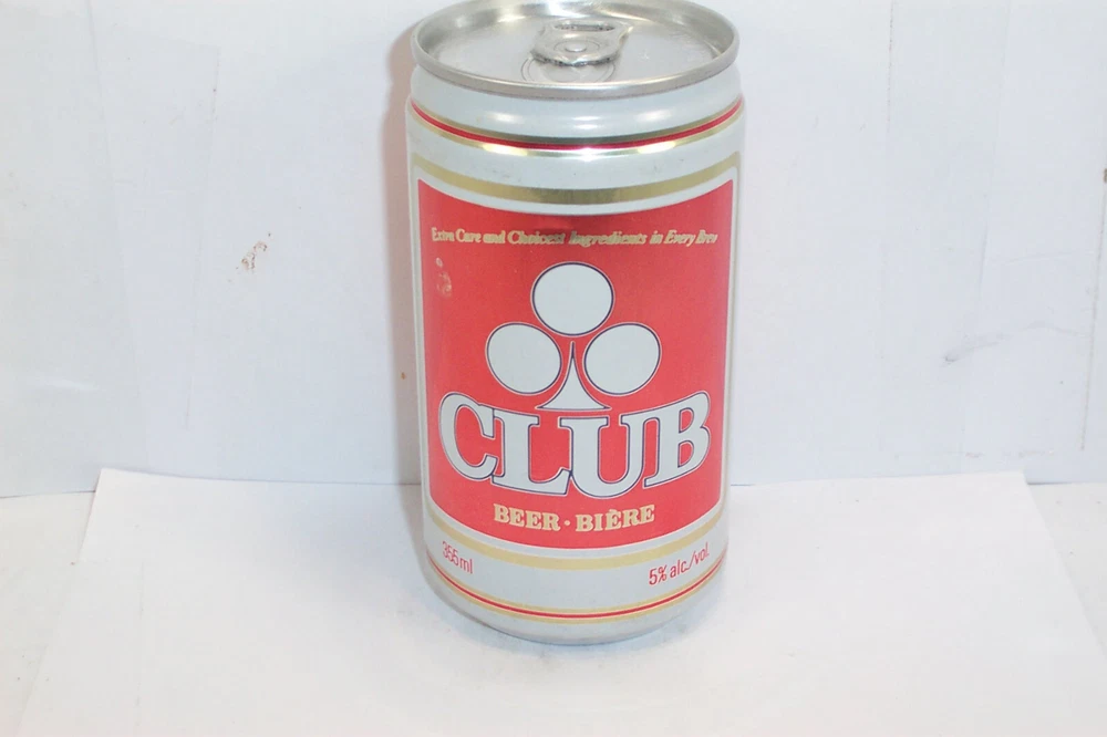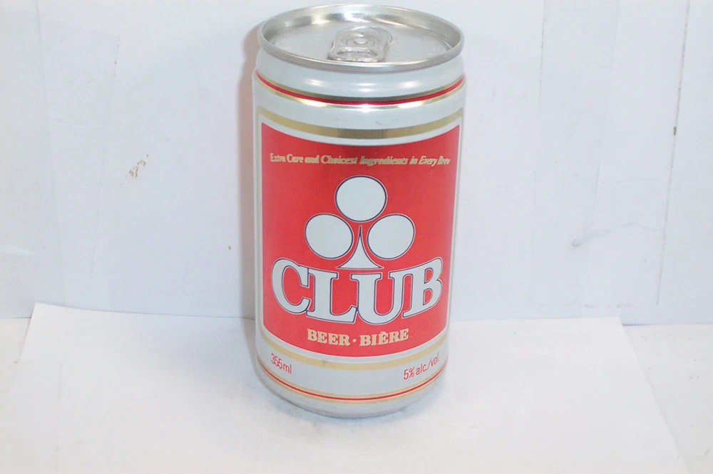 The item offered in this auction is a 355ML (12oz.) aluminum stay tab top beer can: Club Beer Biere by Labatt Brewing Co. Ltd., London,Vancouver, Edmonton, Saskatoon, Winnipeg, Toronto, Montreal, St. John, Halifax, St. John's, Canada. This Club can is in nice indoor condition. It may have small imperfections typically found on aluminum beer cans. A close examination of the pictures will give you the best analysis of condition. This beer can is empty and contains no liquid. I will gladly combine beer can auctions to save on shipping costs. BCCA # 1133