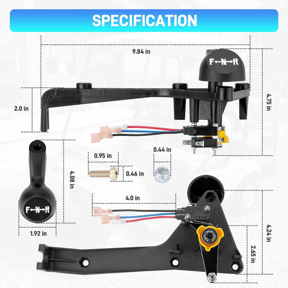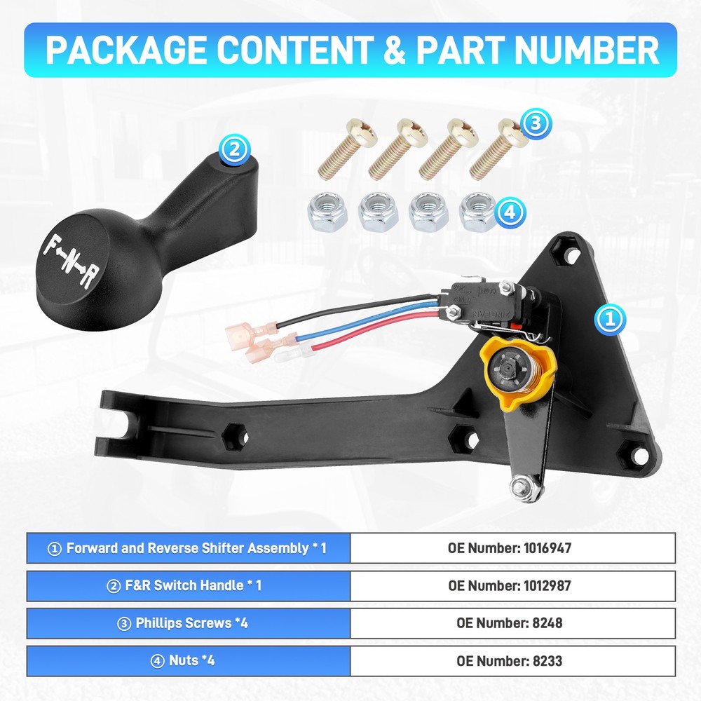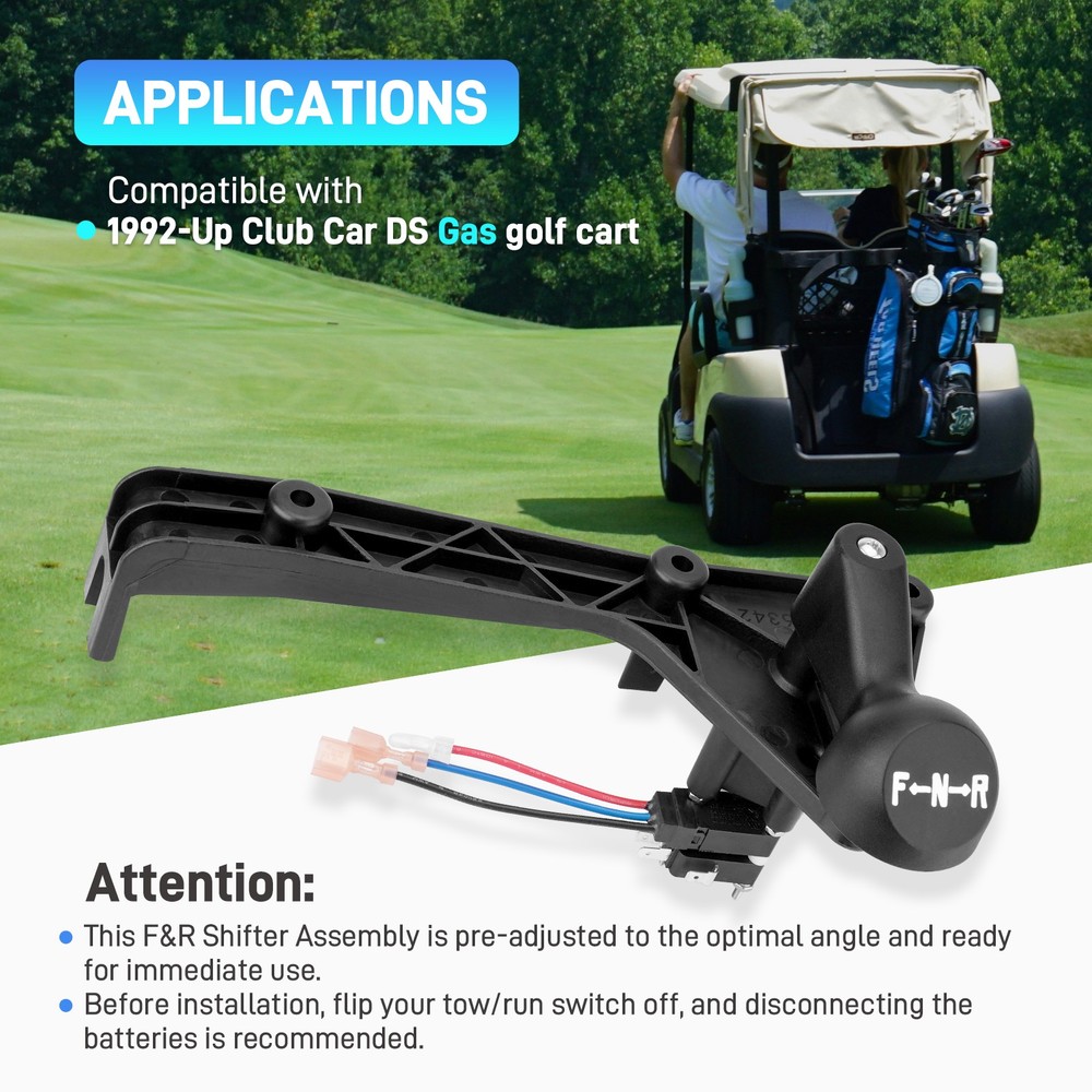 Club Car Forward Reverse Shifter Assembly for 1992-up DS Gas Golf Cart 1016947 Product Description Application: Compatible with 1992-Up Club Car DS golf cart. As a direct replacement for OEM part #1016947, our F&R shifter assembly kit ensures seamless installation and reliable performance Smooth Shifting: Engineered for precise control, our F&R shifter assembly offers effortless switching between forward and reverse gears, improving your golf cart’s handling and driving experience Attention: This F&R Shifter Assembly is pre-adjusted to the optimal angle and ready for immediate use. Before installation, flip your tow/run switch off, and disconnecting the batteries is recommended Purchase with Confidence: We provide 1 year product quality support to our customers. If you have any questions about our products, please feel free to contact us, we will reply to you within 24 hours Package Content & Part Number: 1* Forward and Reverse Shifter Assembly (# 1016947); 4* Phillips Screws (# 8248); 4* Nuts (# 8233). Designed for a straightforward, bolt-on installation with no complex modifications required Note: 1.We provide clear pictures, measurements where possible. Please check as much as possible to make sure the item is the one that you need. 2.Please allow 1-10mm deviation due to manual measurement. 3.Due to light and screen difference, the item's color may be slightly different from the pictures. 4.make sure that the size and shape of the product matches your car. 5.No installation guides are included, we highly recommend to seek professional installation. Any damage during installation will not be refunded.