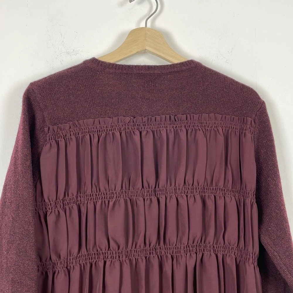 Club Monaco Wool Blend Pullover Long Sleeve Sheer Back Stretch Knit Sweater Womens M. FEATURES: Flaws: None visible, pre-loved Good Condition Style Profile: Wine color, casual, comfortable, soft, career Approximate measurement Pit: 18" Length: 22" BV-3-0038812072024