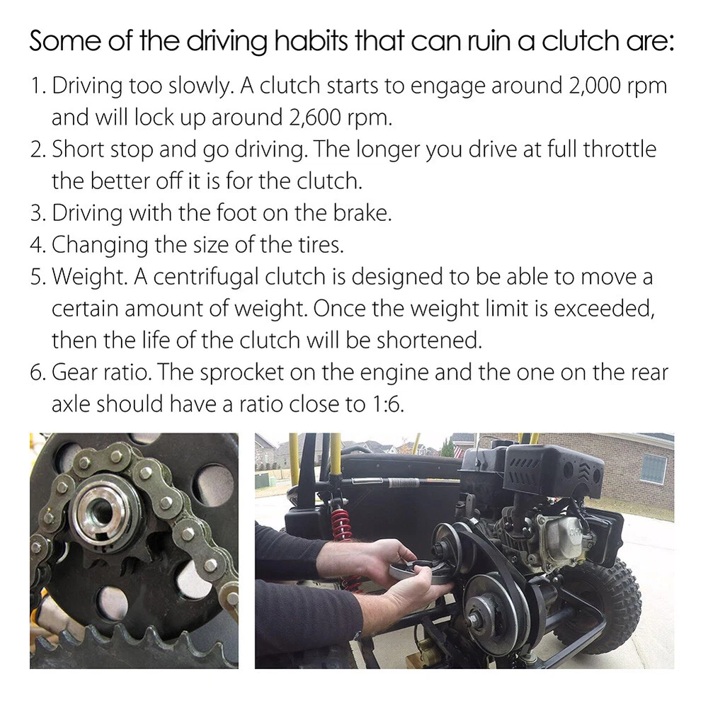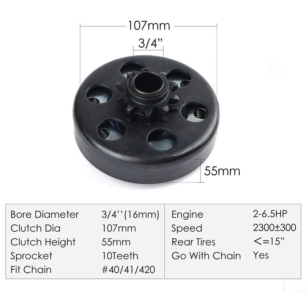 Features: Assembly used on all versions of the Baja Mini Bike, including the Baja Heat, Mini Baja, and the Baja Warrior. It is compatible with both the MB165 and the newer MB200 models. This item is also a perfect replacement part on much small utility 163cc 5.5 Hp and 196cc 6.5 Hp engines. Specification: Clutch Bore: 3/4" Sprocket: 10 teeth with 3 Feet #40/41/420 chain Clutch Diameter: 107 mm Clutch Height: 55 mm Engagement Speed: 2300±300 RPM Recommended Engine: 2 HP - 6.5 HP, 3/4" shaft with flat key Fits: 2-6.5hp Honda & Honda Cloned Engines GC160, GC190, GX120, GX140, GX160, GX200 Perfect For Go Kart Minibike Baja Mini Bike MB165 & MB200 (Baja Heat, Mini Baja, Baja Warrior) Common clutch for 3.5-7hp engines using #40/41/420 chain Briggs & Stratton and 2 - 6.5 HP With 3/4" Shaft Tecumseh Engines 2 - 6.5 HP With 3/4" Shaft Oiling the clutch is extremely important Behind the snap ring, next to the sprocket teeth at the end of the clutch. There's an internal bronze bushing behind the snap ring that requires lubrication and it's up to you to put it there each time. It's a good idea to oil the chain at the same time. If the chain gets kinky from lack of oil it should be replaced before it damages the clutch sprocket. A new chain is cheaper than a new clutch. Note: The Centrifugal Clutch 3/4" needs to be oiled before use. Before ordering please check your crankshaft size. Don't put oil inside the clutch holes: The holes on the drum are to let the hot air out of the clutch. DO NOT SQUIRT OIL IN THESE HOLES. When oil gets in the drum portion of the clutch it will cause excessive slippage, which means undue heat will be generated. This Kit Includes: 1 x 10 teeth centrifugal clutch 1 x #40/41/420 chain 1 x connecting link Payment Shipping Feedback About us Contact us Payment 1. We accept PayPal,G Pay Credit Card,Visa ,etc. payment . 2. Please do not include your PO BOX address, or eBay system won't allow you to make the payment. 3. Please make payment within 7 days after placing an order, or eBay will automatically open an unpaid case on the eighth day. 4. You can contact us for sure if you want to cancel the order to avoid the unpaid case. Shipping 1. All orders ship within 24 hours after receiving your payment. 2. Tracking information will be sent to the buyer once we get the tracking number. 3. We only ship to eBay or PayPal address. PO. BOX Not Acceptable. 4. If you want us to ship to a different address, please contact us via eBay message after placing your order Feedback 1. We are really appreciated that all the customers can give us 5-star positive feedback. It will encourage us doing better, no matter the quality of the products or after sale service. We are learning more. 2. Please don't give us neutral and negative feedback before contacting us. Don't forget that good communication can solve all problems. Any questions, please feel free to send message to us first. We are always here to help you. Thank you very much. About us Welcome to our store! We supply many products including computers accessories, health & beauty , phone accessories, car accessories & Consumer Electronics, Pet accessories ,High product quality, reasonable prices, excellent customer service and a reliable credit standing is our tenet. Thank you for shopping at our eBay Store. Contact us 1. ALL replies will be sent to your email, if you don't get response within 1-2 business days, pls check your My Messages in case your email provider has an overly-aggressive spam filterblocking eBay's emails. Please email us AGAIN. 2. Email is the priority of our customer service.