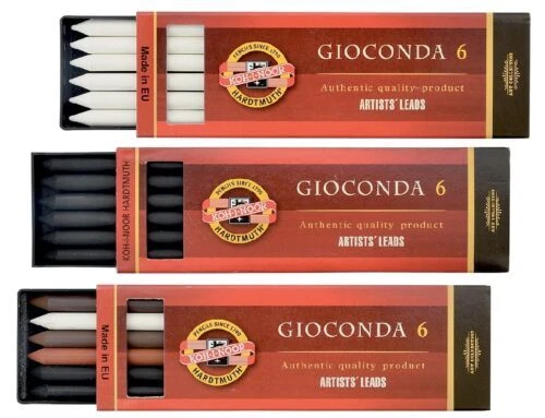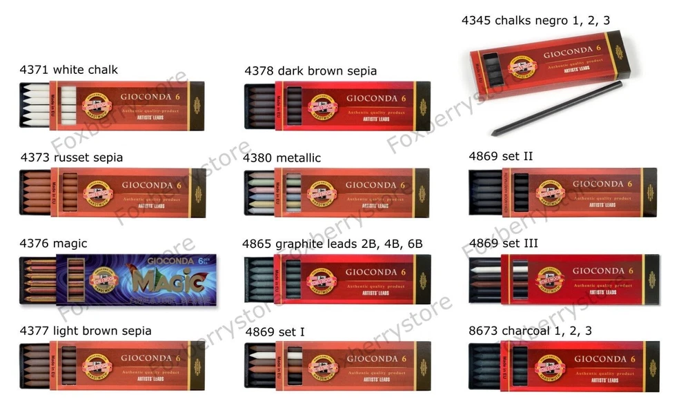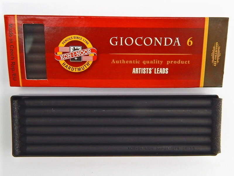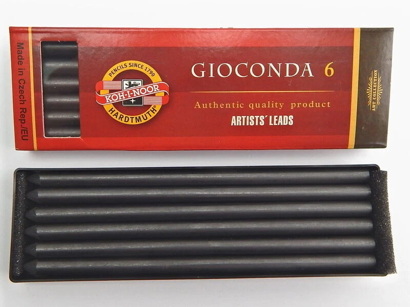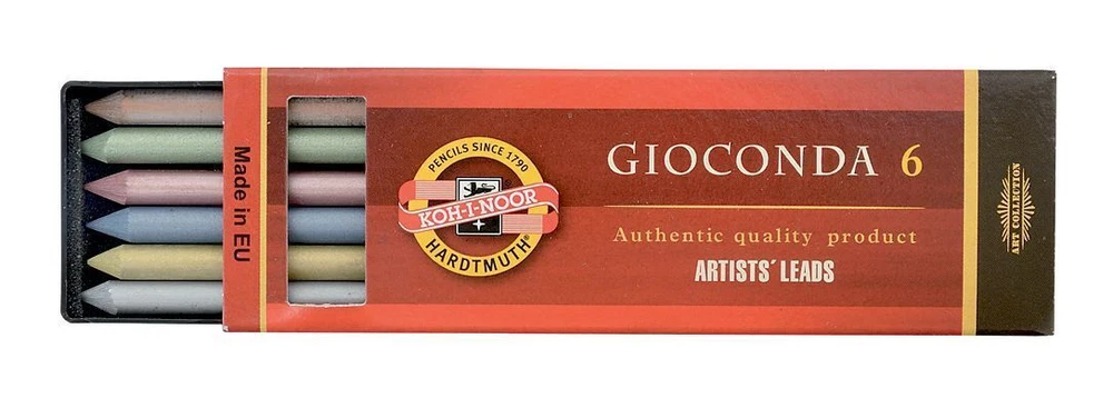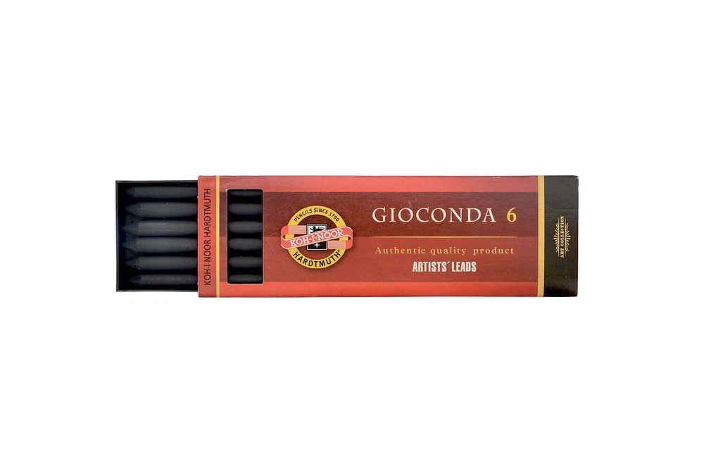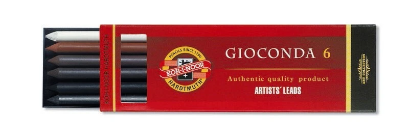 Drawing Chalks Graphite 5.6mm x 120mm Lead Refills Koh-I-Noor Gioconda mines for artist for mechanical pencil clutch lead holder A brand new, unopened, unused, undamaged genuine Koh I Noor lead refills. In its original retail packaging. 6 lead refills in a plastic package. Lead diameter: 5.6 mm Lead length: 120mm contain 6 leads Plastic package: 128mm x 40mm x 13mm 4345 Koh-I-Noor Gioconda black drawing chalks negro Leads for artist’ s drawing 5,6mm 120mm 4345 1,2,3 Leads for artist’ s drawing Sepias, red chalks, artificial charcoals and special chalks for artists as leads for mechanical pencils, diameter 5,6 mm. Hardness: 1 soft, 2 medium, 3 hard 4345 1 - soft leads - KIN code: 4345001004PK, EAN: 8593539129653 4345 2 - medium leads - KIN code: 4345002004PK, EAN: 8593539129677 4345 3 - hard leads - KIN code: 4345003004PK, EAN: 8593539129691 4371 white chalk Koh I Noor Gioconda white drawing chalks 5,6mm 120mm 4371 Sepias, red chalks, artificial charcoals and special chalks for artists as leads for mechanical pencils, diameter 5.6 mm. KIN code: 4371001004PK, EAN: 8593539129714 4373 Russet sepia leads Koh I Noor Gioconda brown drawing chalks russet sepia 5,6mm 120mm 4373 Sepias, red chalks, artificial charcoals and special chalks for artists as leads for mechanical pencils, diameter 5.6 mm. KIN code: 4373002006PK, EAN: 8593539129738 4376 magic leads Koh I Noor Gioconda metallic and colored leads for artist´s drawing magic 5,6mm 120mm 4376 Special multicolor leads for mechanical pencils of diameter 5.6 mm. The trace has color variable nature. 7 colors. KIN code: 4376000002PK, EAN: 8593539129752 4377 Light brown sepia leads Koh I Noor Gioconda drawing chalks light brown sepia 5,6mm 120mm 4377 Sepias, red chalks, artificial charcoals and special chalks for artists as leads for mechanical pencils, diameter 5.6 mm. KIN code: 4377011006PK, EAN: 8593539129493 4378 Dark brown sepia leads Koh I Noor Gioconda drawing chalks dark brown sepia 5,6mm 120mm 4378 Sepias, red chalks, artificial charcoals and special chalks for artists as leads for mechanical pencils, diameter 5.6 mm. KIN code: 4378012006PK, EAN: 8593539129516 4865 Graphite leads 2B, 4B, 6B for artist’ s drawing Koh I Noor Gioconda Graphite leads for artist’ s drawing 5,6mm 120mm 4865 Graphite leads of the highest quality for mechanical pencils only in soft grades and diameter 5.6 mm for artistic drawing or common use. Hardness: 2B, 4B, 6B 4865 2B leads - KIN code: 486502B009PK, EAN: 8593539129578 4865 4B leads - KIN code: 486504B009PK, EAN: 8593539129554 4865 6B leads - KIN code: 486506B009PK, EAN: 8593539129530 4869 lead sets Sets of leads for artist‘s drawing Koh I Noor Gioconda set of drawing chalks leads for artist‘s drawing 5,6mm 120mm 4869 Sepias, red chalks, artificial charcoals and special chalks for artists as leads for mechanical pencils, diameter 5.6 mm. 4869 I leads set contains: 4865/4B Graphite Lead, 8673/1 Artificial Drawing Charcoal, 4378 Dark Brown Sepia, 4377 Light Brown Sepia, 4373 Russet Sepia, 4371 White Chalk KIN code: 4869006003PK, EAN: 8593539148227 4869 II leads set contains: 8673/1 Soft Artificial Drawing Charcoal, 8673/2 Medium Artificial Drawing Charcoal, 4865/2B Graphite Lead, 4865/4B Graphite Lead, 4865/6B Graphite Lead, 4345/2 Medium Black Drawing Lead KIN code: 4869006004PK, EAN: 8593539148340 4869 III leads set contains: 4345/2 Medium Black Drawing Leads, 8673/2 Medium Artificial Drawing Charcoal, 4373 Russet Sepia, 4377 Light Brown Sepia, 4371 White Chalk, 4378 Dark Brown Sepia KIN code: 4869006005PK, EAN: 8593539148364 8673 charcoal Artificial drawing charcoal Koh I Noor Gioconda artificial drawing charcoal 5,6mm 120mm 8673 Artistic artificial charcoals burnt in the lead shape of diameter 5.6 mm, intended for mechanical pencils or in the form of square 7x7x75mm. Suitable for black and white artistic drawing that needs to be stabilized by a suitable fixing agent after the work is finished. Hardness: 1 soft, 2 medium, 3 hard 8673 1 - soft charcoal - KIN code: 8673001005PK, EAN: 8593539129592 8673 2 - medium charcoal - KIN code: 8673002005PK, EAN: 8593539129615 8673 3 - hard charcoal - KIN code: 8673003005PK, EAN: 8593539129639 4380 metallic leads KIN code: 4380000001PK, EAN: 8593539132905 4381 silver metallic leads - KIN code: 4381000002PK, EAN: 8593539129776 4382 gold metallic leads - KIN code: 4382000002PK, EAN: 8593539129790 4383 blue metallic leads - KIN code: 4383000001PK, EAN: 8593539132820 4384 pink metallic leads - KIN code: 4384000001PK, EAN: 8593539132844 4385 green metallic leads - KIN code: 4385000001PK, EAN: 8593539132868 4386 cuprum metallic leads - KIN code: 4386000001PK, EAN: 8593539132882 HIGH QUALITY LOOKING FOR ANOTHER KOH-I-NOOR PRODUCT? PLEASE CONTACT US! KOH-I-NOOR HARDTMUTH is one of the world leaders in the production and distribution of first-rate stationery for artists, schools and offices. The company was founded by Josef Hardtmuth in 1790 in Vienna; however, the production of graphite leads was relocated to České Budějovice in 1848. In the course of time, the KOH-I-NOOR pencils managed to achieve great success at a number of world exhibitions. The products were awarded in many world exhibitions, to name a few, 1855 in New York, 1856, 1900 and 1925 in Paris, 1862 in London, 1882 in Vienna and 1905 in Milan. mine artistiche Kunstlerminen minas artisticas umetnicke mine muveszetei bel minas para artistas wklady do olowka artystyczne mine pentru desen artistic mines artistiques