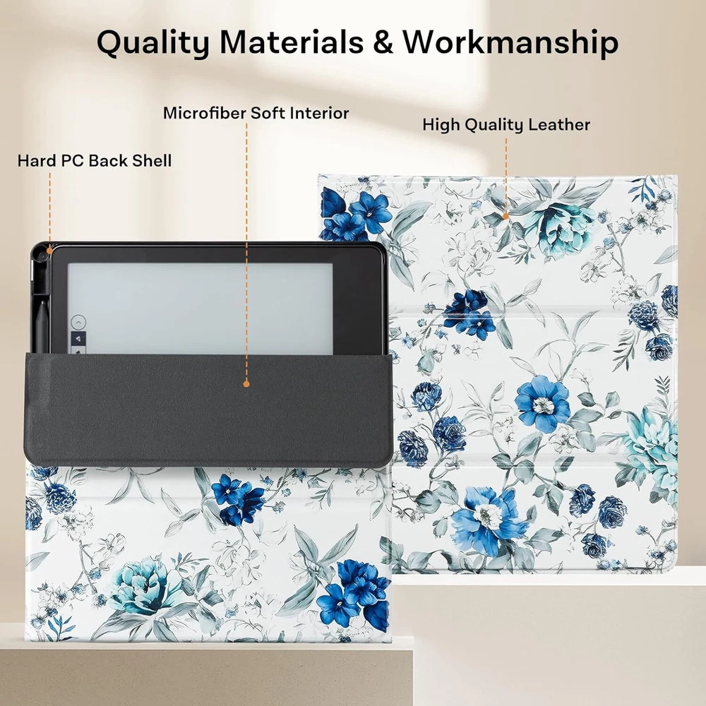 CoBak Stand Case for Kindle Scribe - Premium Folio Leather Cover Blue Blossom Product Details Brand: CoBak Color: Blue Blossom Compatible Devices: Kindle Scribe Form Factor: Case Shell Type: Soft 【Compatibility】: This specially designed cover features a perfect cutout and shape, exclusively tailored for the all-new Kindle Scribe 10.2" 2022/2024 Release, ensuring a precise fit and compatibility with this device only 【Heavy Duty】: Durable hard PC shell and high-quality PU leather protect devices from drops, bumps, and scratches. Withstand hard work and extreme conditions. It is highly durable and resistant to damage. Let you Experience unparalleled strength and durability 【Auto Wake/Sleep】:Enjoy hassle-free reading with the smart case that effortlessly wakes up or puts your Kindle e-reader to sleep. Plus, the magnetic closure ensures 360-degree protection for your device, making it safe at all times 【Two Viewing Angles】:Transform your tablet into a comfortable reading and writing angle with our unique tri-fold front cover design. With this feature, you can free your hands and have extra time to focus on other tasks 【Pen Holder Design】:Special design with a Replace Pen Tip Holder and Pen Holder, this product offers enhanced convenience. Its slim and lightweight design ensures that it won't add any extra bulk to your device, making it easy to carry and use on the go