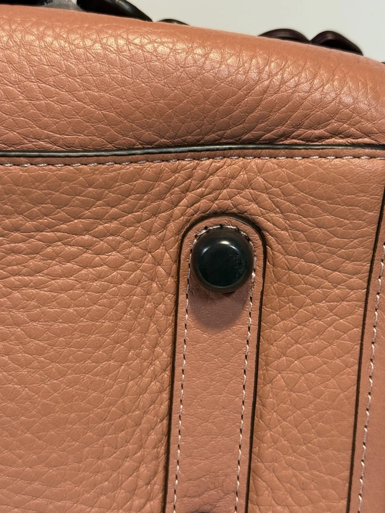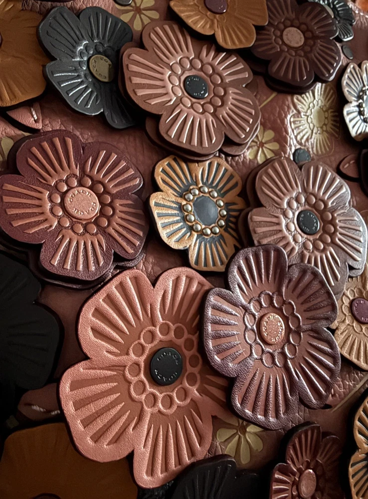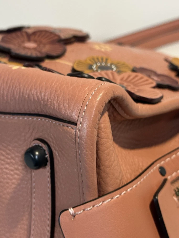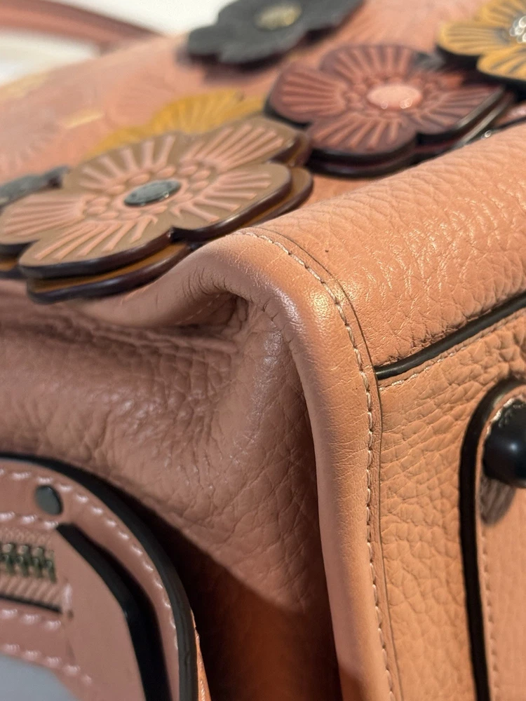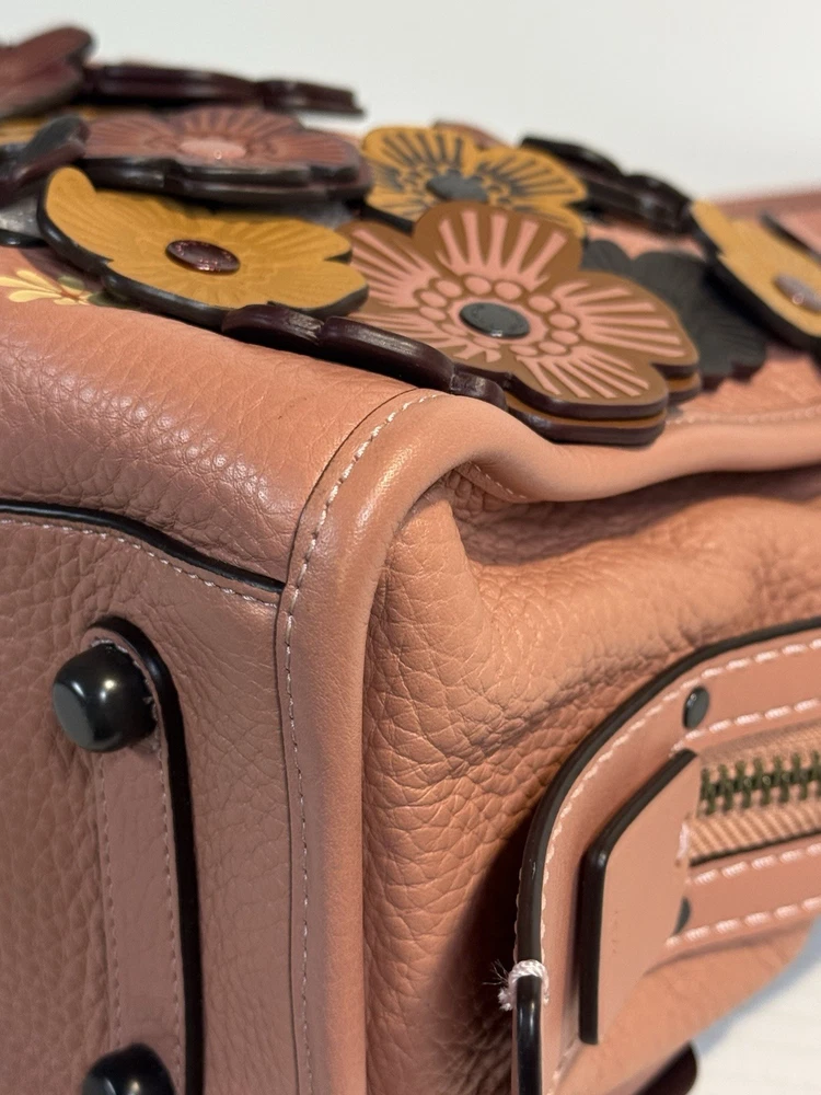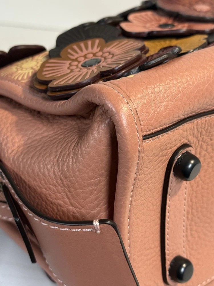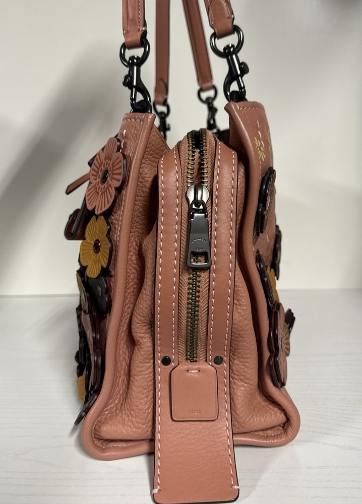 Coach Rogue Tea Rose bag in melon, featuring dimensional floral detailing and gunmetal hardware. This style is no longer available. Condition: The bag is pre-owned but lightly used and in excellent condition, with minimal wear consistent with gentle use. Structure and details are well maintained. Comes with its original dust bag Details: • Gunmetal hardware Dimensions: • Length: 12 1/4” • Height: 9 3/4” • Width: 5 1/2” Please note, this bag is not new with tags.
