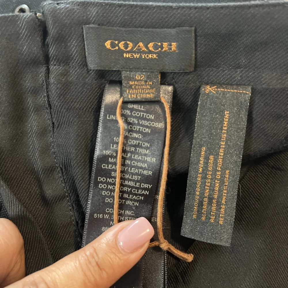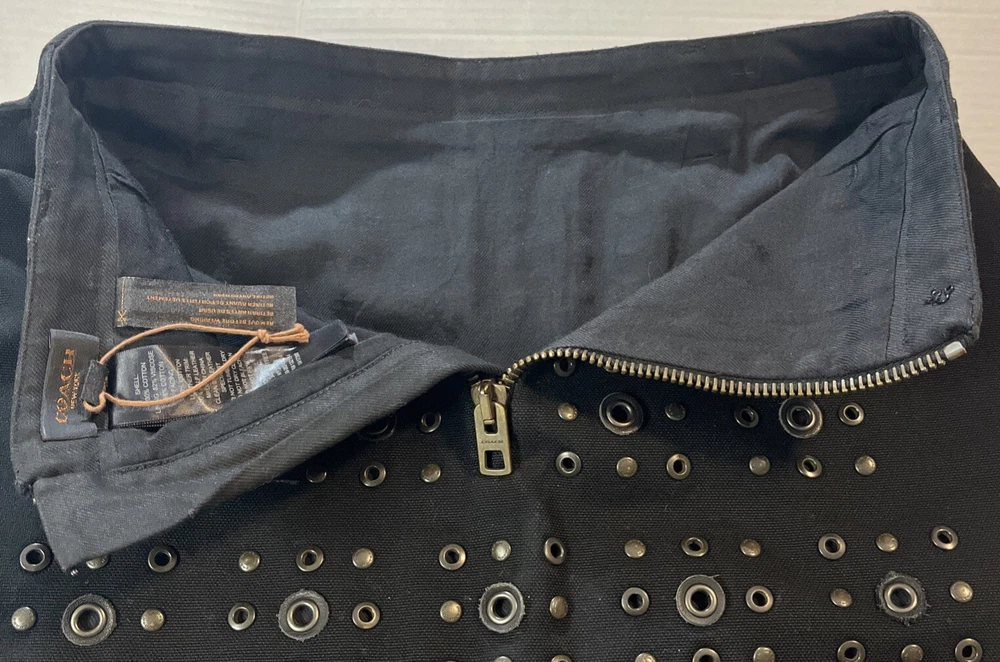 Size Type: Regular Theme: City, Metal, Preppy Skirt Length: Short Accents: Zipper, Rivets Department: Women Rise: Mid Closure: Zip Color: Black Size: 2 Features: All Seasons, Lined Pattern: Rivets Garment Care: Clean By Leather Specialist Fabric Type: Leather Trim Vintage: No Season: Fall, Spring, Summer, Winter Handmade: No Type: Skirt Character: Stylish Personalize: No Brand: Coach Occasion: Casual, Party/Cocktail, Travel Style: Mini Country of Origin: China Material: Cotton