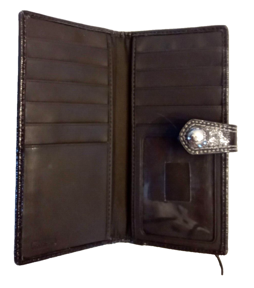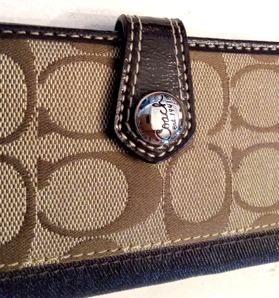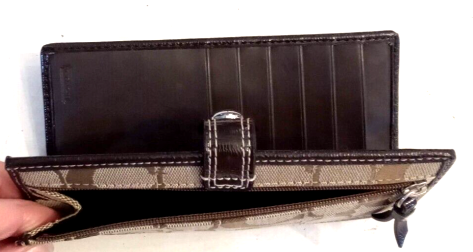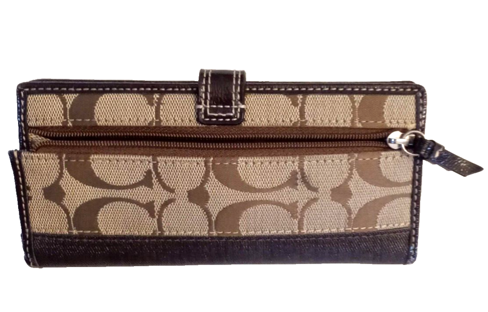 This is a beautiful Y2K vintage Coach brown leather bi-fold snap wallet with a signature design. Measures approx 6.25" wide by 3.25" tall by 1" thick (when empty). It features 10 card slots, an ID window, and an outer zipper pocket. Closes with a signature metal snap Clean, Smoke Free, Pet Free Home Listing more nice hand bags this week, please check my store Use the cart feature in the listing to combine purchases and save postage,