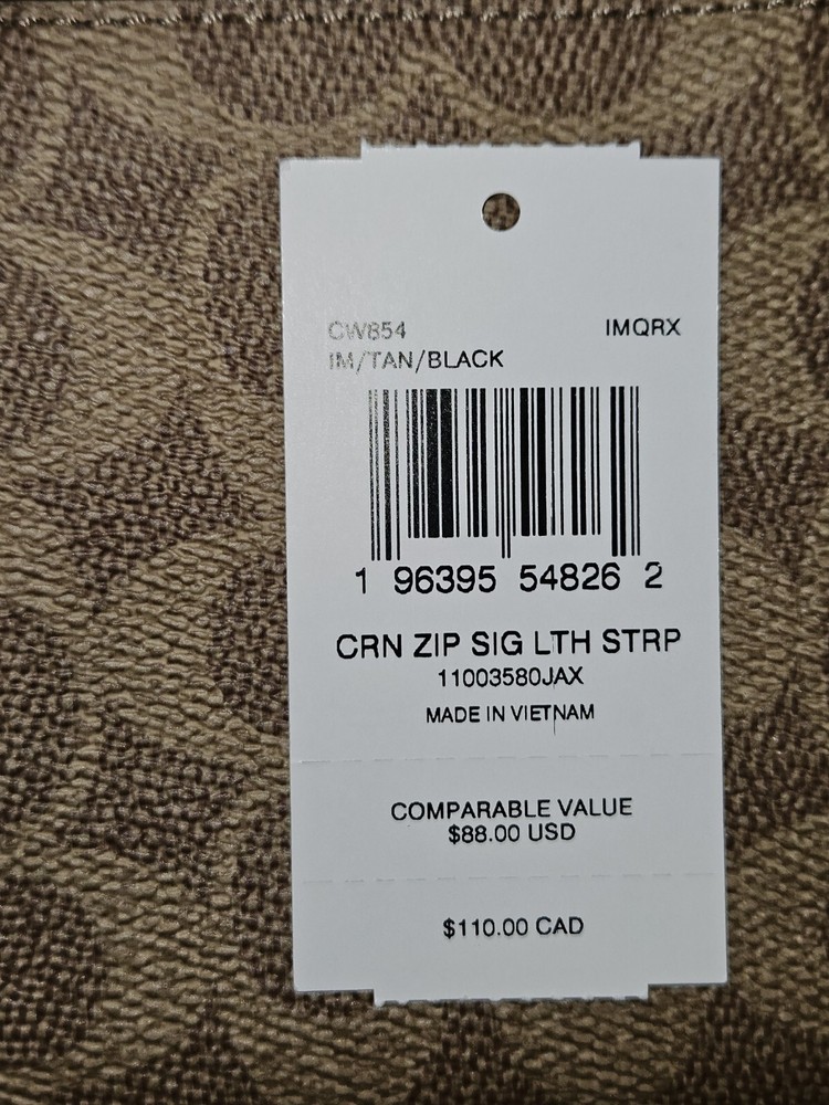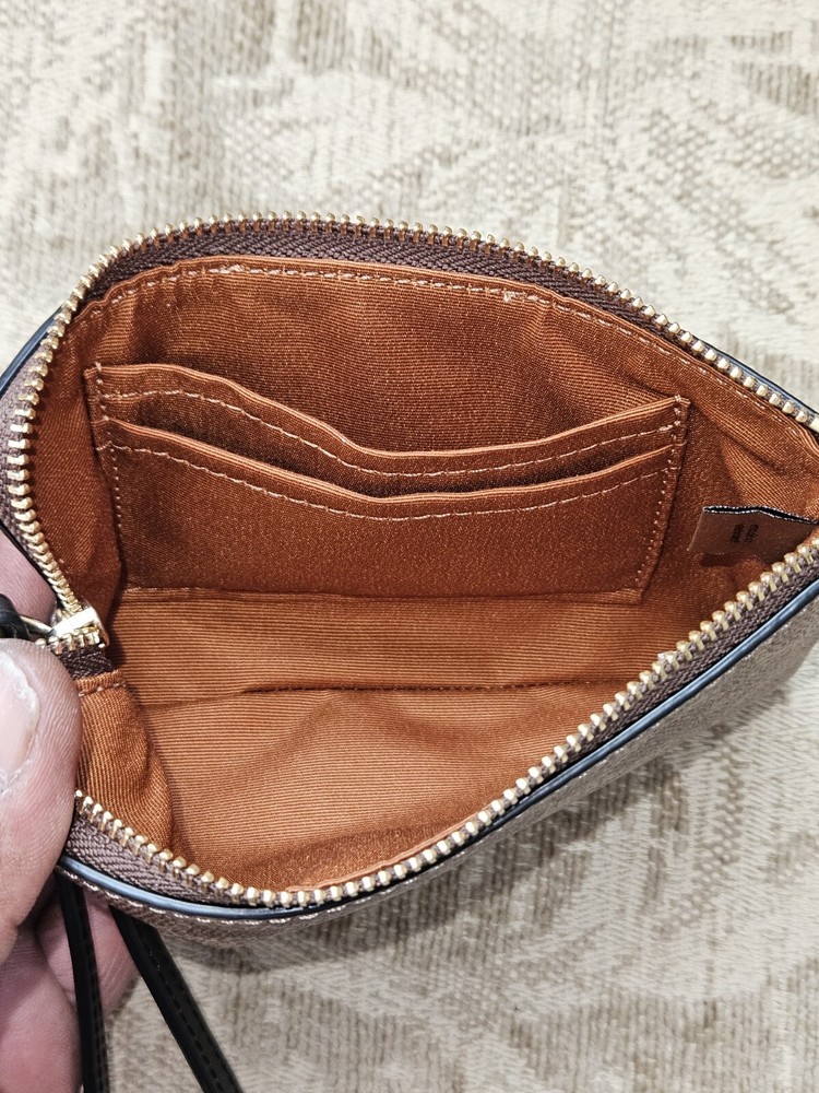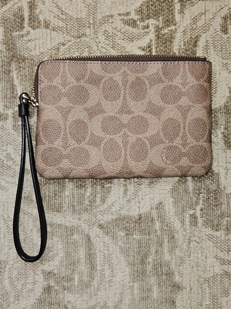 Coach Corner Zip Signature Wristlet #CW854 Tan/Black With Leather Strap New With Tags Retails $88