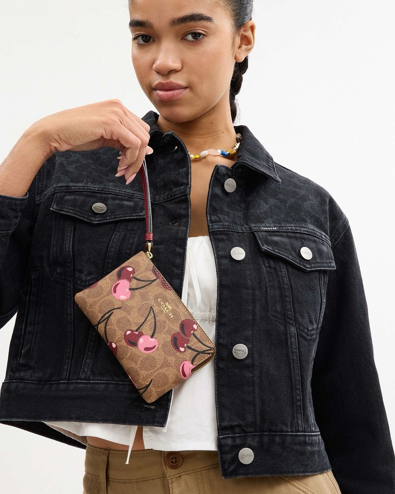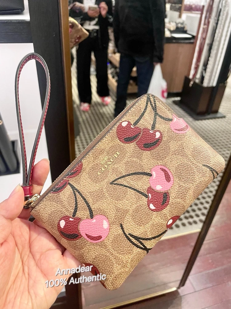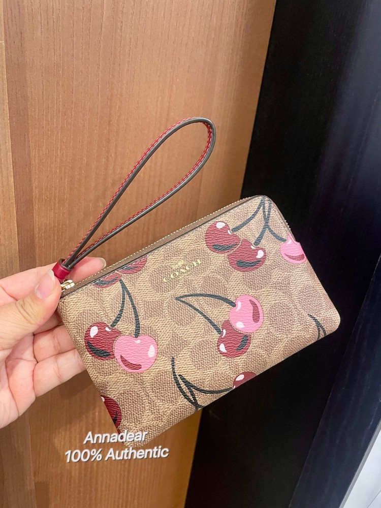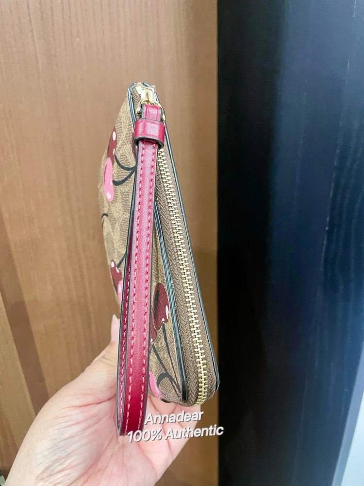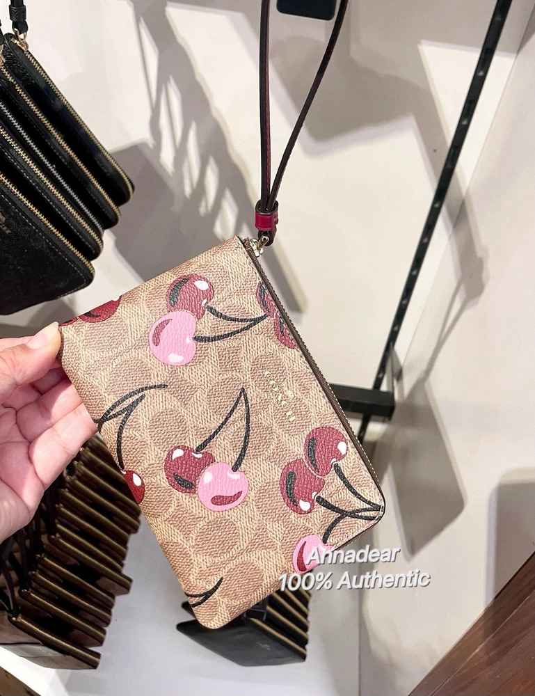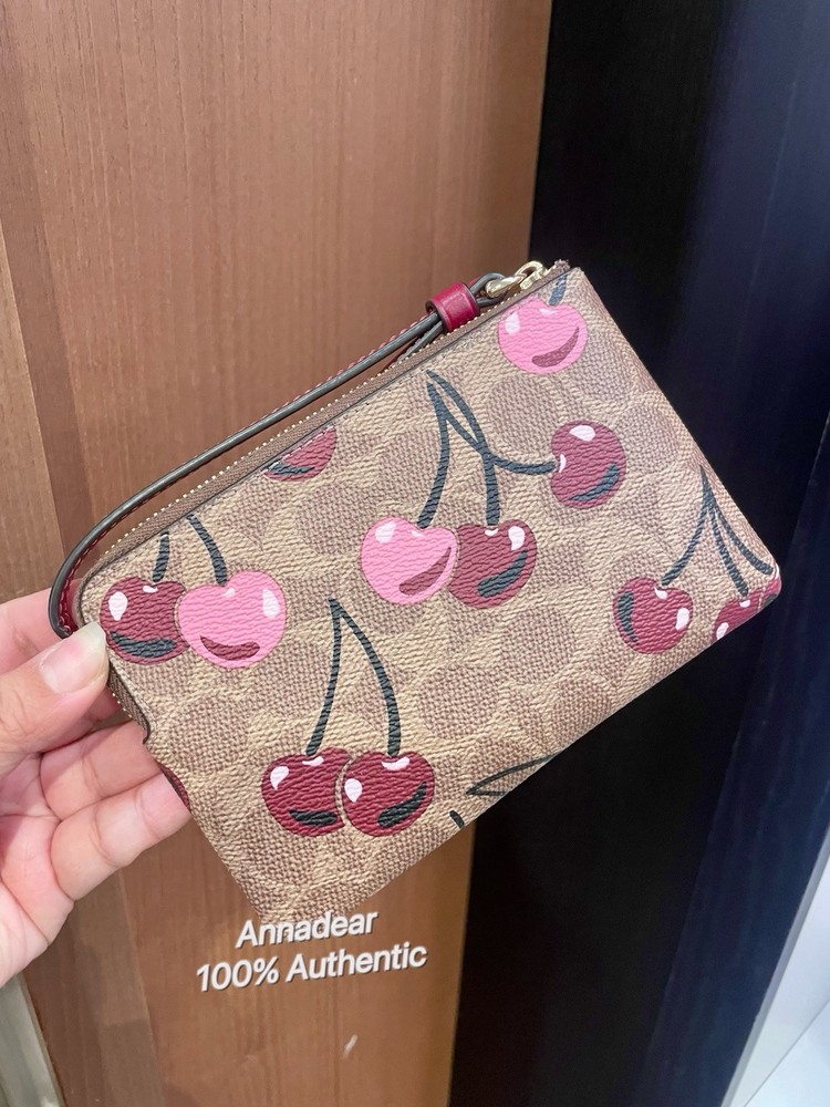 Coach Corner Zip Wristlet In Signature Canvas With Cherry Print Brand new with tags 100% Authentic Style Number CZ450 Measurements Length: 6.25" Height: 4.0" Width: 0.5" Materials Signature coated canvas Fabric lining Features Two credit card slots Zip-top closure Wrist strap attached Editor's Notes Our Corner Zip Wristlet in Signature canvas is an everyday essential that won’t weigh you down. Compact yet functional, this small wristlet wallet has space for your keys, cards and even an iPhone (up to a 15 Pro Max). Featuring a sweet print, this cherry wristlet is finished with a strap for ease and a zip-top closure to secure your items. To keep your cards handy on the go, organize them in the convenient built-in slots. Price is firm