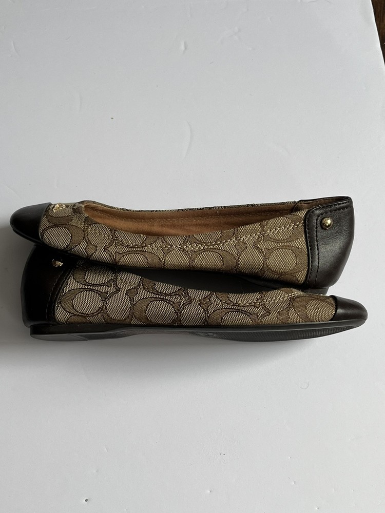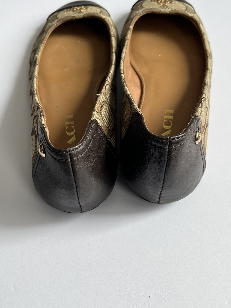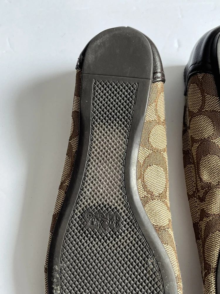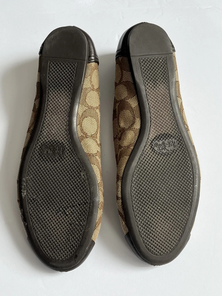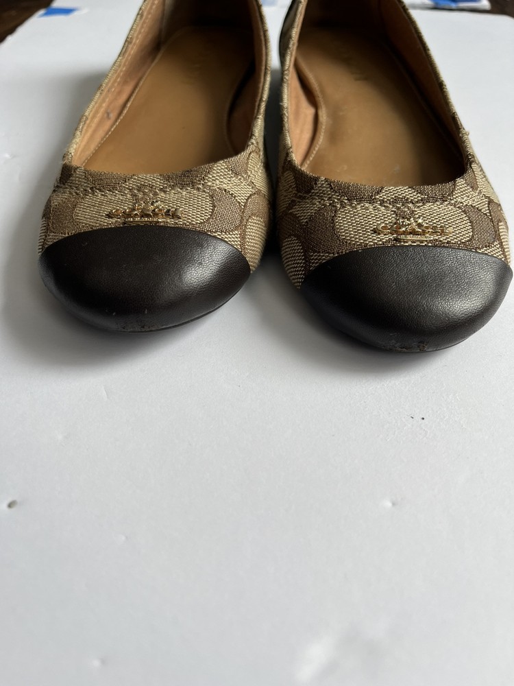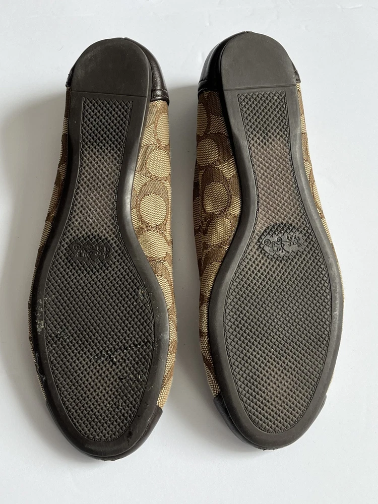 These Coach Chelsea flats for women are a size 7 and feature a tan fabric with brown leather detailing. They are slip-on ballet-style shoes with a solid pattern. The upper material is leather with a fabric lining and leather insole for comfort. The outsole is made of leather, and they have a B width. The design includes the Coach logo accents, making them suitable for travel, casual, and business occasions. Small scuffle on the front as it show on picture