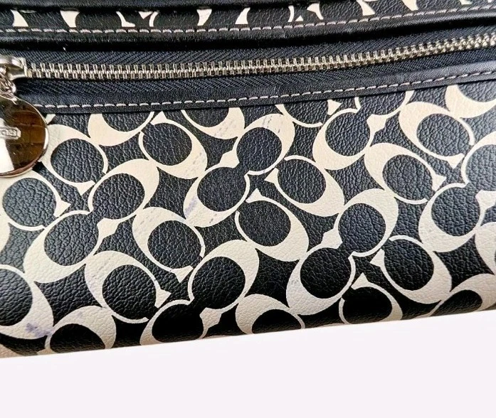 Pen mark in the lining. Purple stain on the wallet. Bottom of the stripe is peeling. Overall, the flaws are hard to see unless you're up close. You're going to beat up your bag- why not save some money and get it pre-loved?