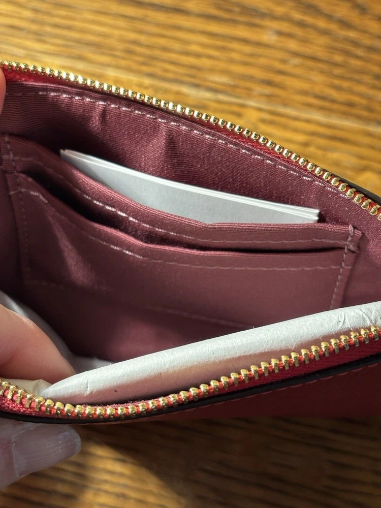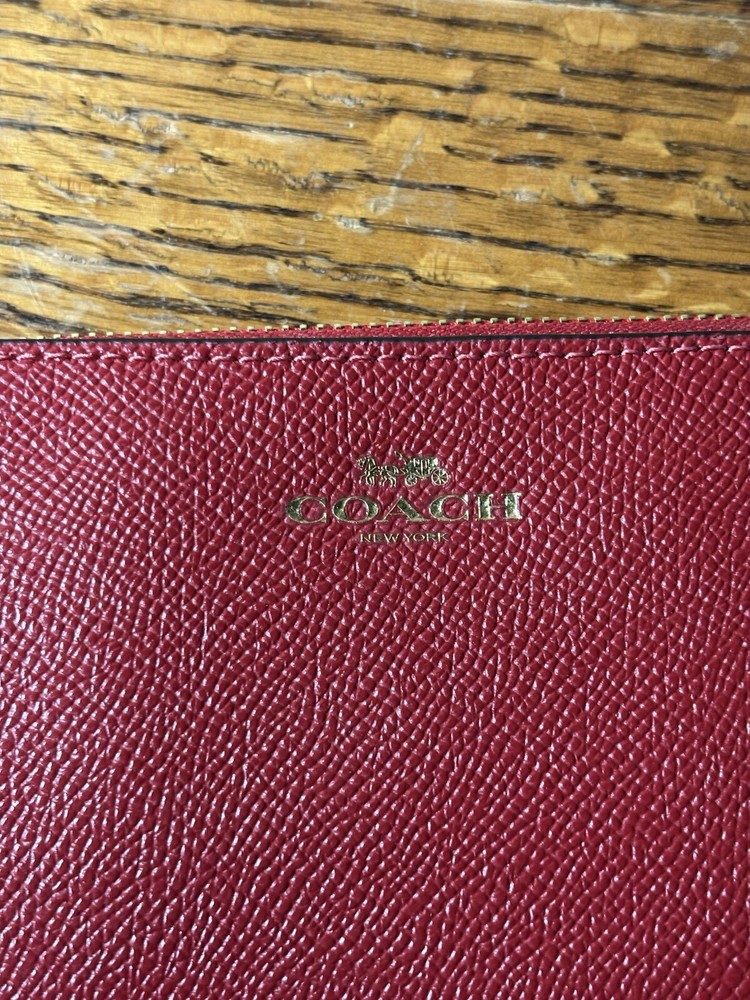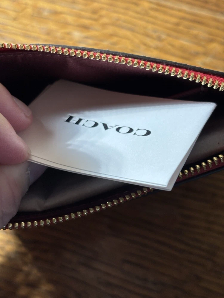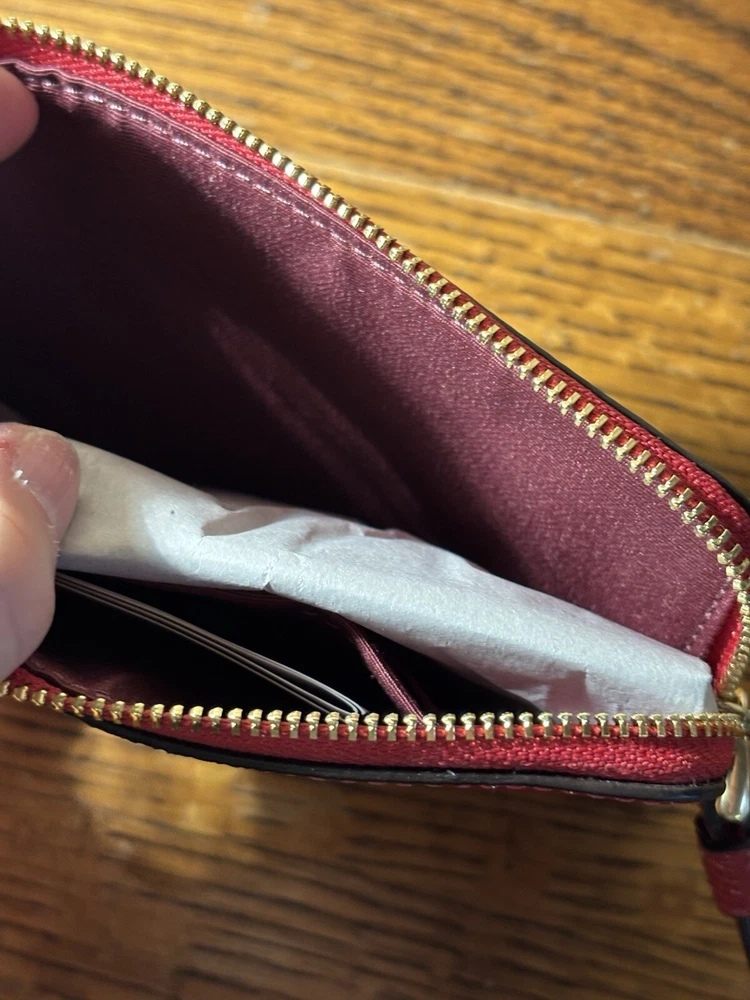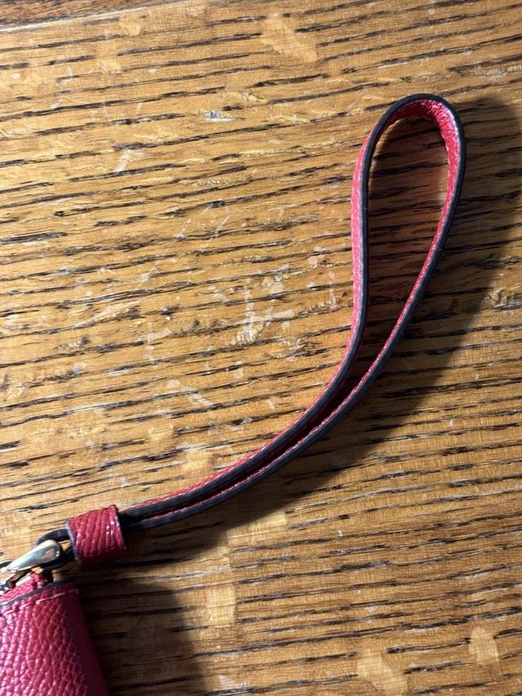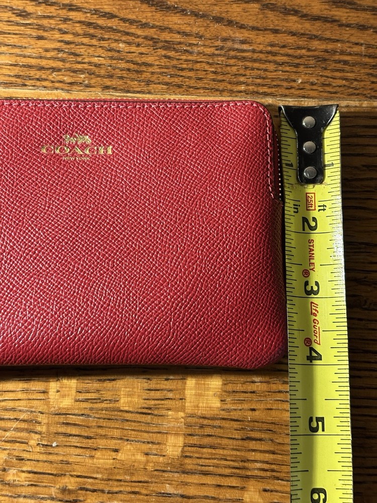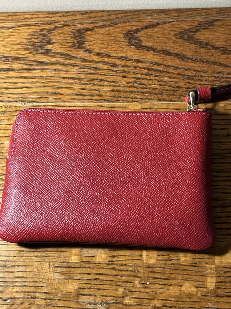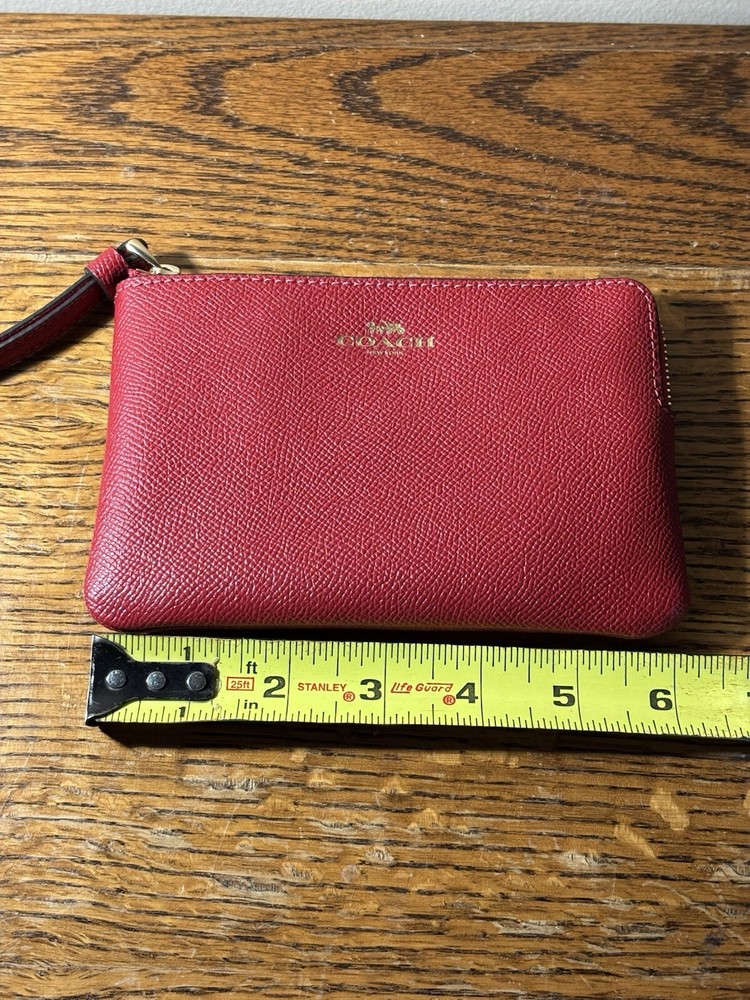 This is a NEW Coach Corner Zip Wristlet in red leather, measuring 6"x4". It features a strap, Coach logo accent, and can hold credit cards. Perfect for women looking for a stylish and functional accessory.