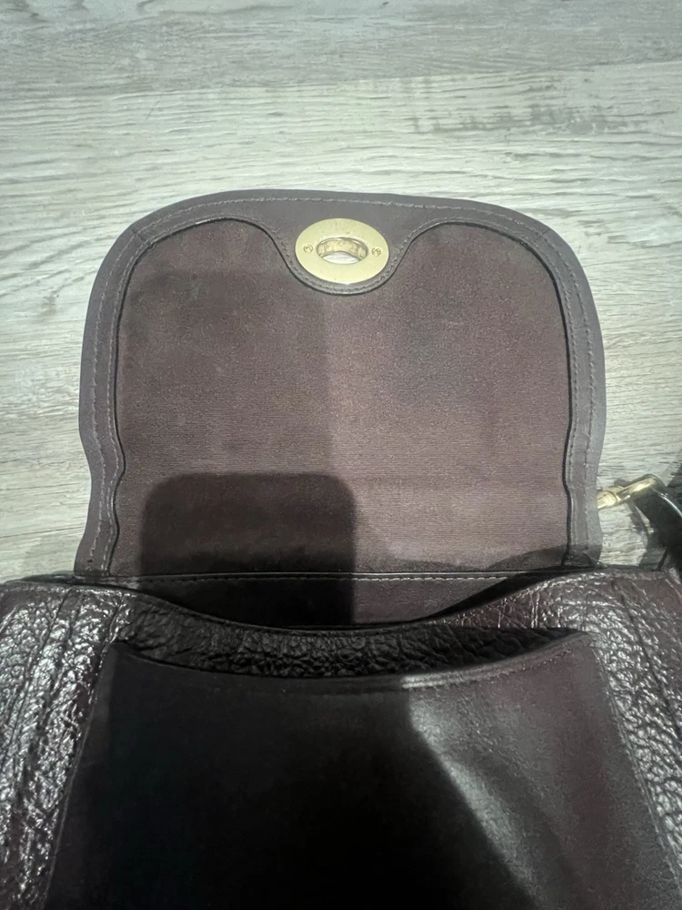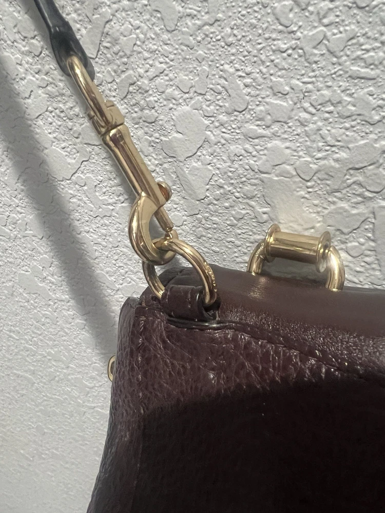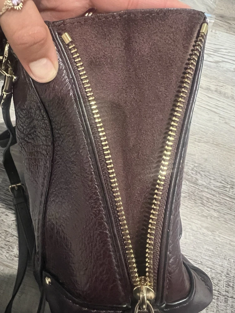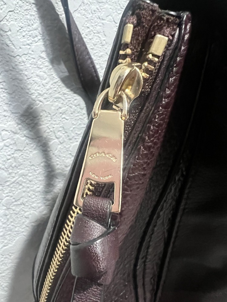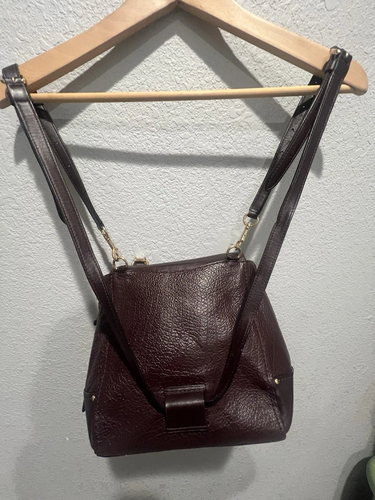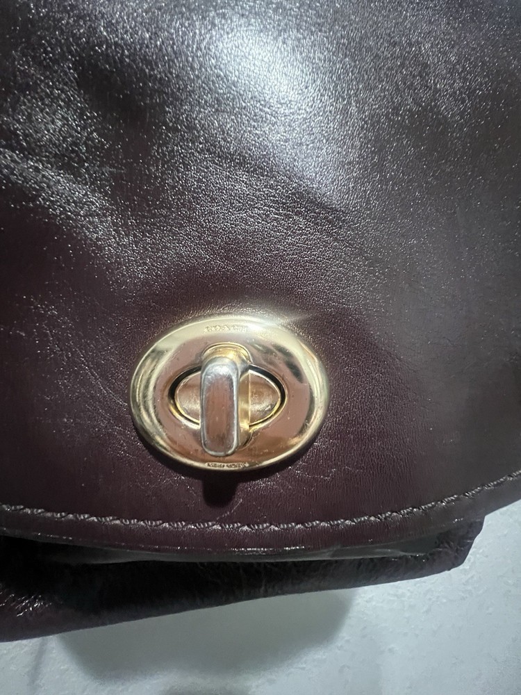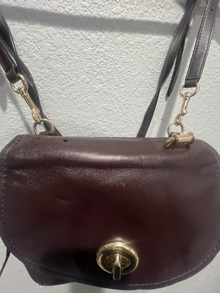 The Coach Faye 2 Way Convertible Dark Purple Shoulder Crossbody Backpack is a versatile and stylish medium-sized bag perfect for various occasions such as travel, weddings, parties, casual outings, formal events, workwear, and business meetings. Made from leather with a pebbled finish, this square-shaped bag features a midnight blue adjustable handle/strap, gold hardware accents, and a zip and turn lock closure. The interior is lined and includes inner and outer pockets for organization. With its convertible design, this backpack can be worn as a shoulder bag or top handle bag, adding flexibility to your outfit. The rare Coach Faye model is a classic designer piece that is sure to make a statement. Sold as is Missing a piece of the hardware