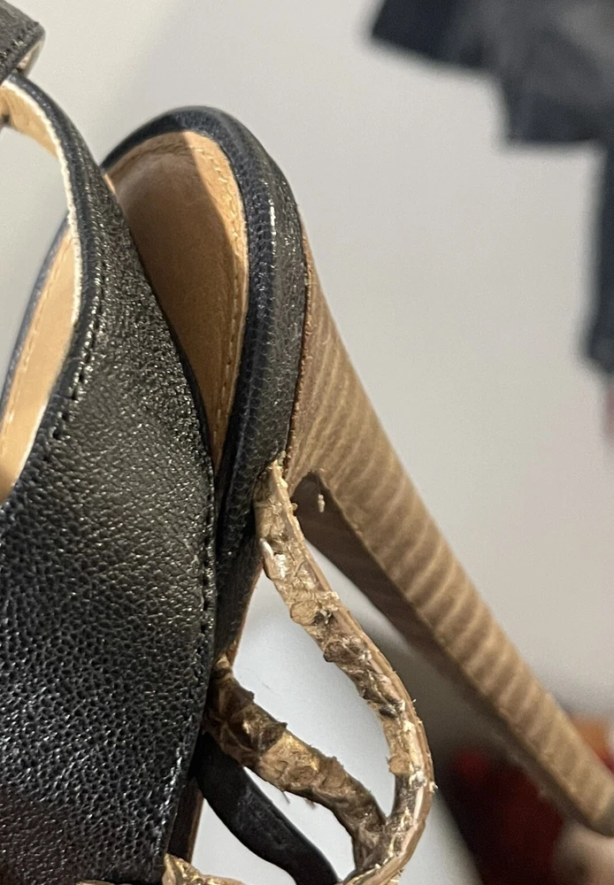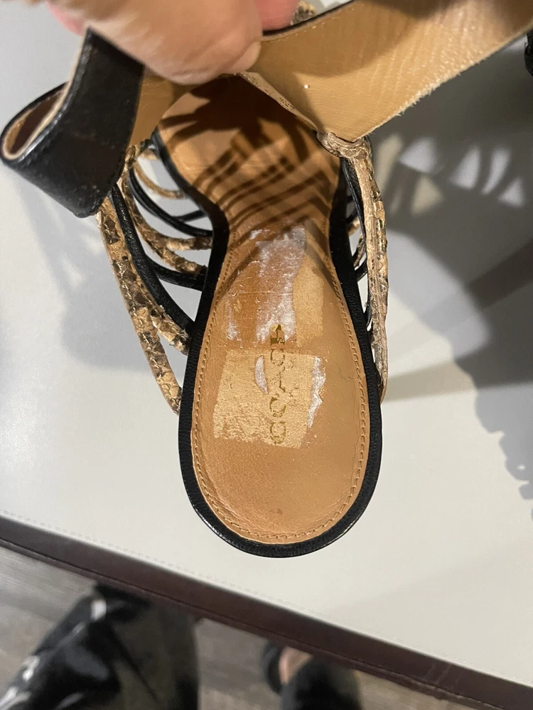 *** there are some sign of imperfection pls refer to pictures, there is sticker left on the right shoes, already removed some and stain at the bottom of the shoes pls refer to pictures** sold as is*** The Coach Jody Python Print Ankle Stiletto is a stylish heel featuring a striking animal print design in black and sand colors. With an open toe and strappy style, these heels are perfect for various occasions like parties, casual outings, and even business events. The ankle strap and adjustable strap provide added comfort and security while the stiletto heel adds a touch of sophistication. Crafted from leather and designed with a unique animal theme, these heels are a fashionable choice for women who want to make a statement with their footwear.