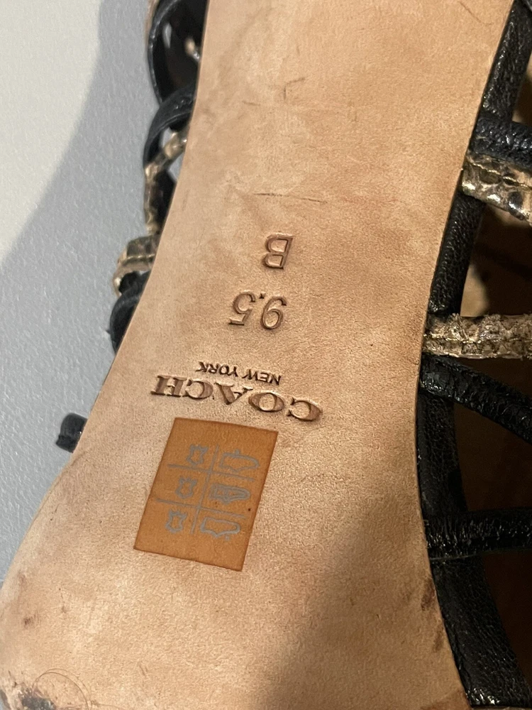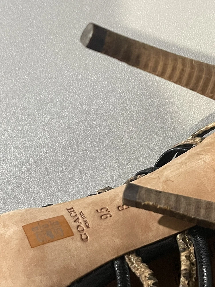 Toe Shape: Open Toe Theme: Animals Type: Heel Upper Material: Leather Country/Region of Manufacture: China Brand: Coach Vintage: No Customized: No Features: Adjustable Strap, Ankle Strap Pattern: Animal Print Style: Strappy Department: Women Heel Style: Stiletto Occasion: Party/Cocktail, Casual, Business US Shoe Size: 9.5 Color: Multicolor