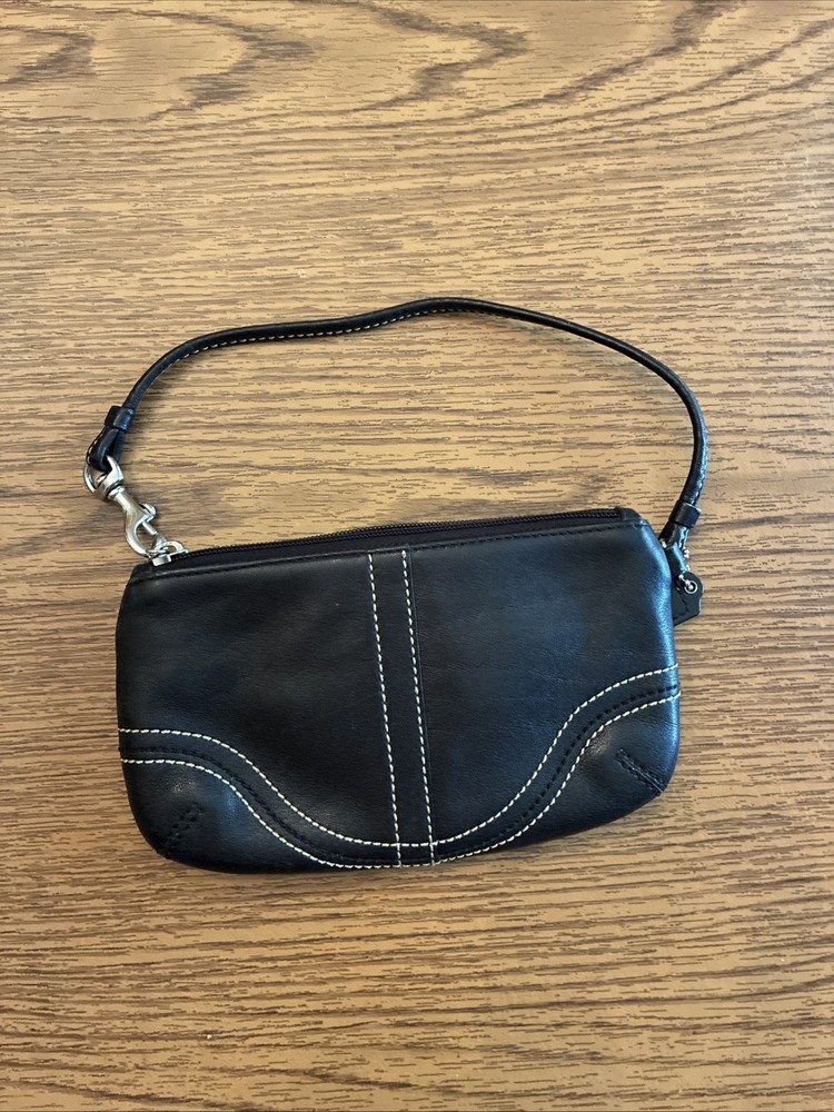 The Coach Purse Wallet is a stylish and compact accessory for women. Made of black leather with silver hardware accents, this rectangular clutch features a zip closure and a fabric lining. It includes inner pockets for organization and comes with a wristlet for easy carrying. The designer brand and sleek design make it a fashionable choice for everyday use or special occasions. This small yet versatile wallet is perfect for adding a touch of luxury to any outfit.