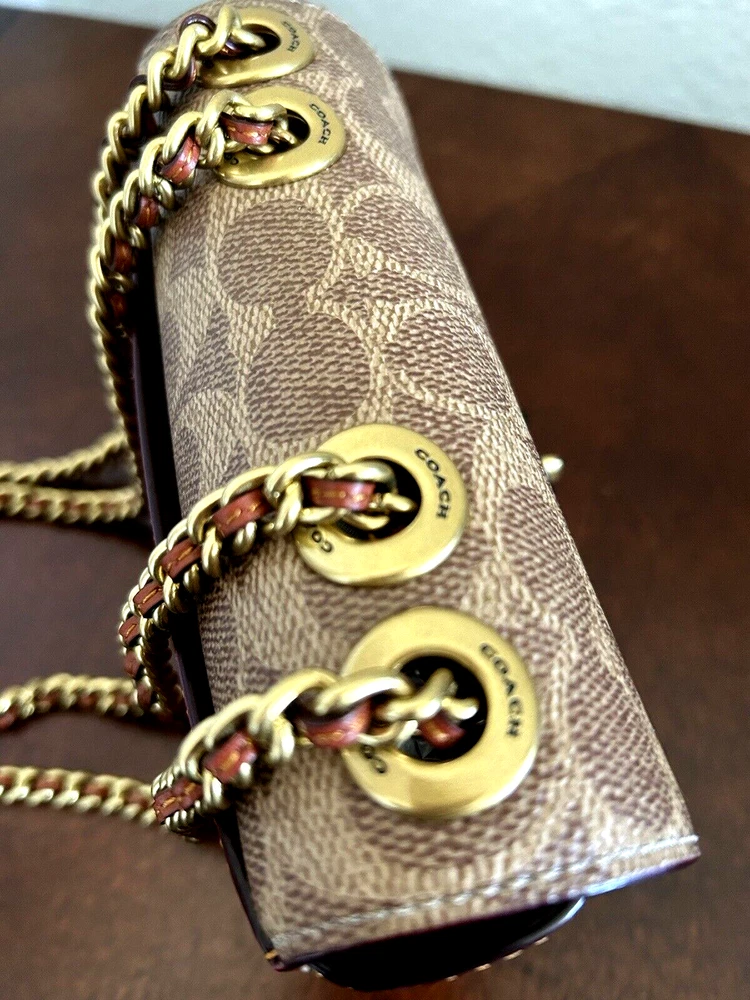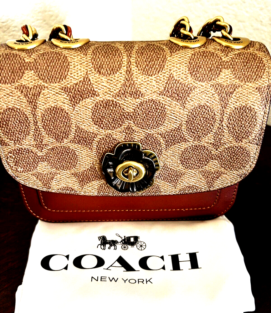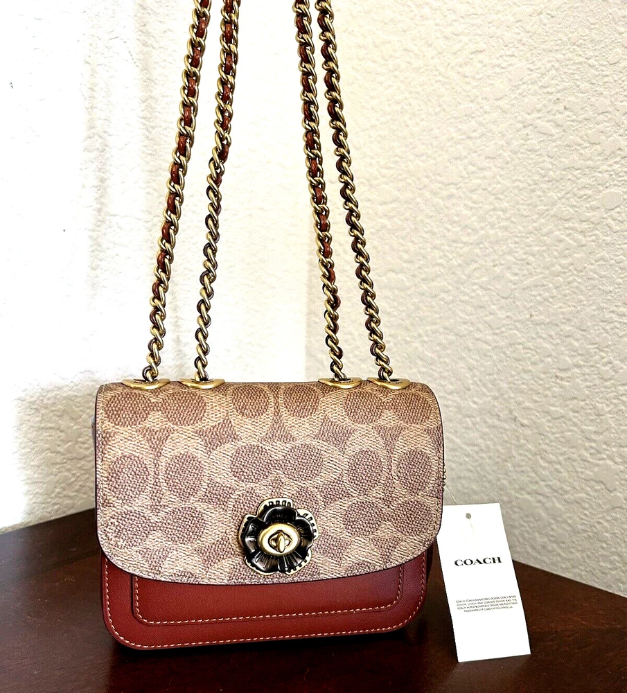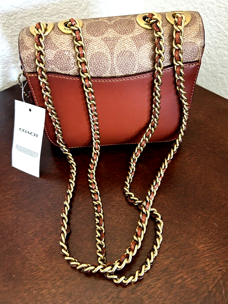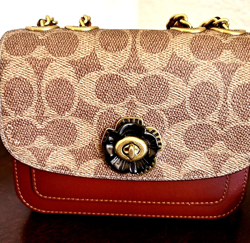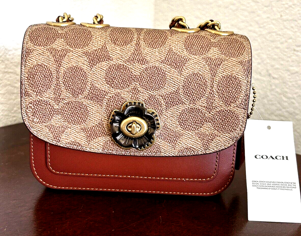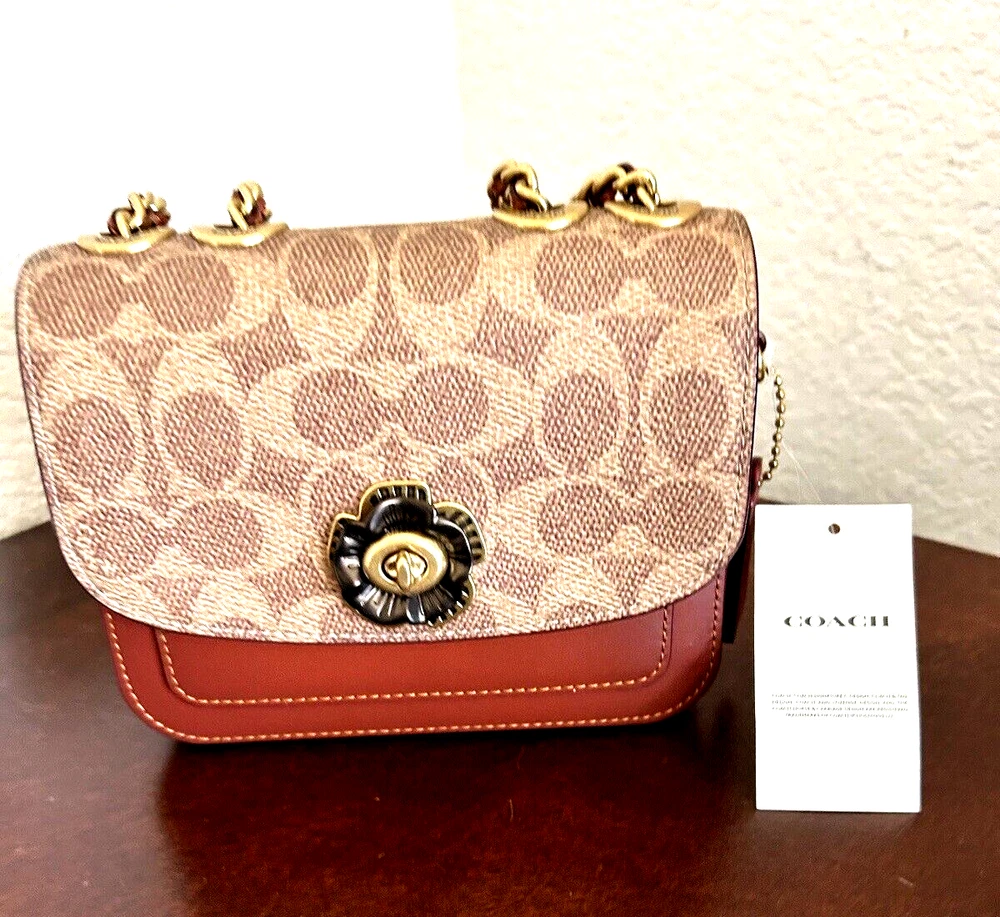 Coach Coated Canvas Two Tone Tea rose Turnlock Signature Madison Shoulder Bag 16 Tan Rust Chain New with Tags Authentic from Coach retail Mini sized bag: 6 1/4W x 5"H x 2"D • Turlock closure • Handles convert to shoulder strap with 22" drop * Gold-tone hardware; 1 slip pocket * 1 interior slip pocket, 3 credit card slots Dust Bag included Gift Giving Condition!