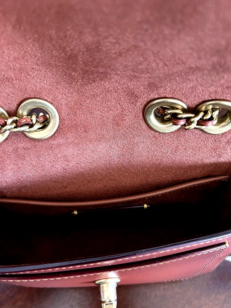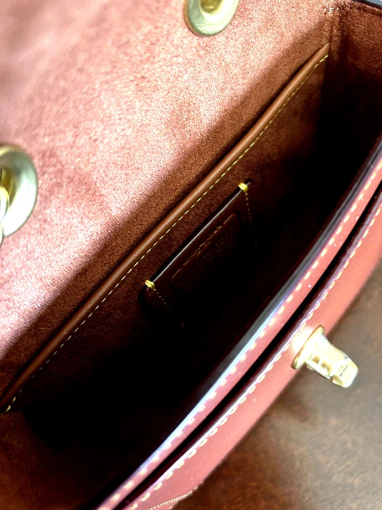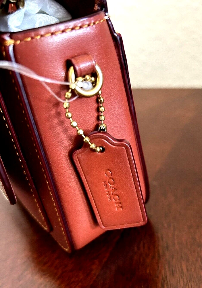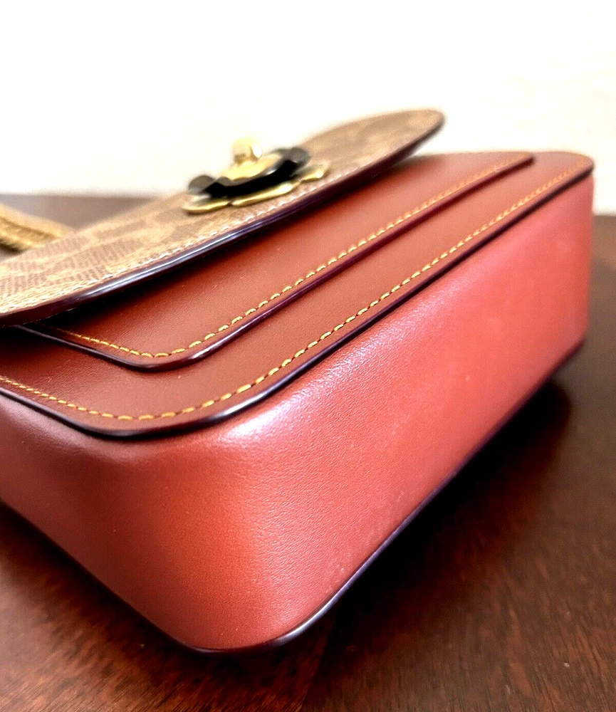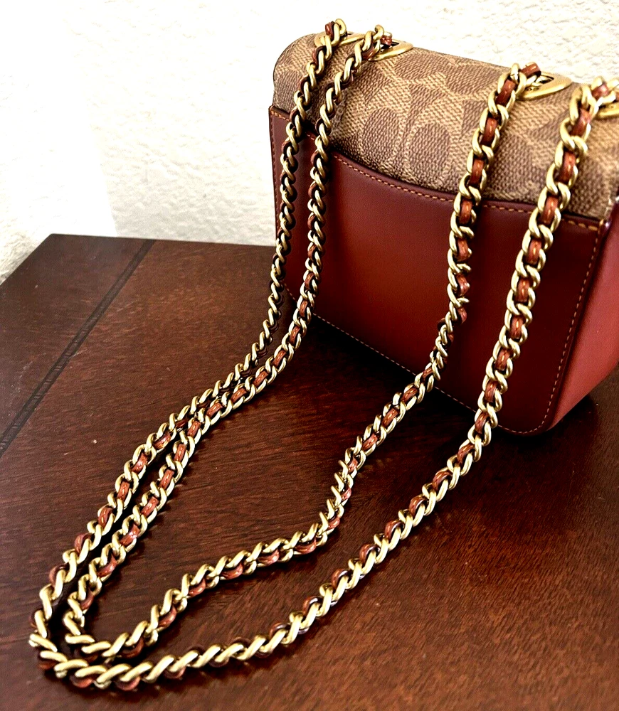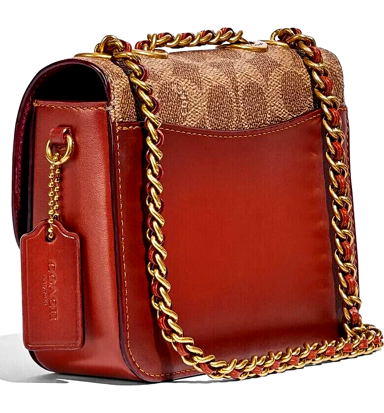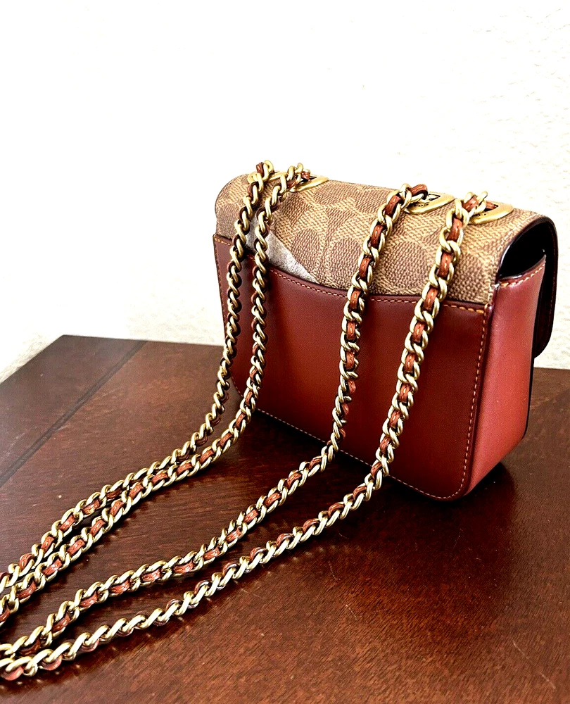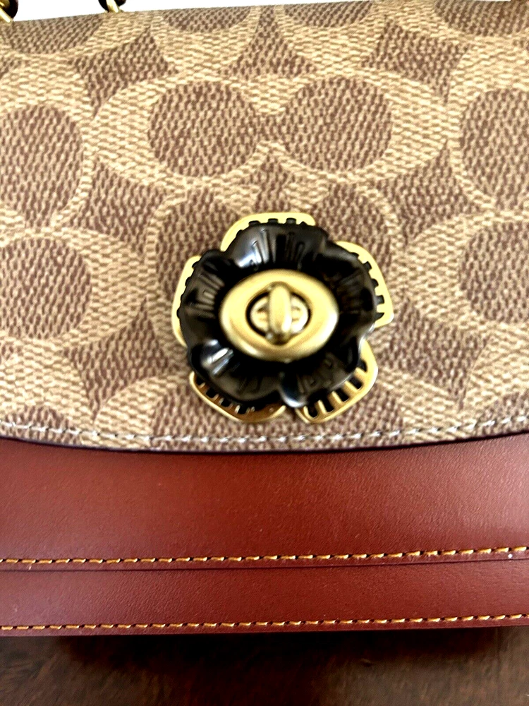 Coach Coated Canvas Two Tone Tea rose Turnlock Signature Madison Shoulder Bag 16 Tan Rust Chain New with Tags Authentic from Coach retail Mini sized bag: 6 1/4W x 5"H x 2"D • Turlock closure • Handles convert to shoulder strap with 22" drop * Gold-tone hardware; 1 slip pocket * 1 interior slip pocket, 3 credit card slots Dust Bag included Gift Giving Condition!
