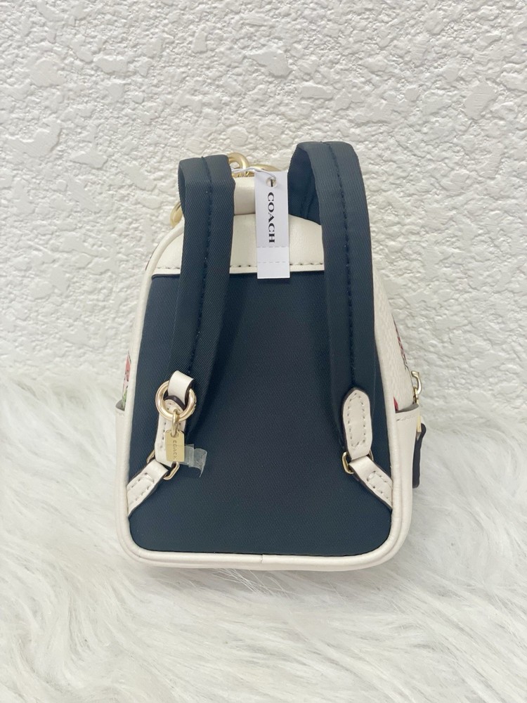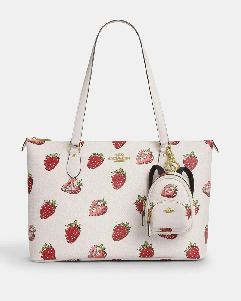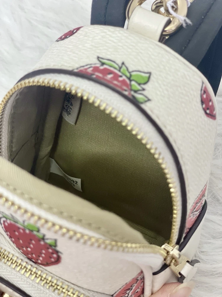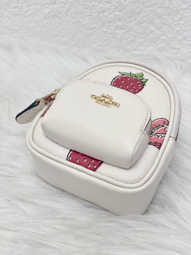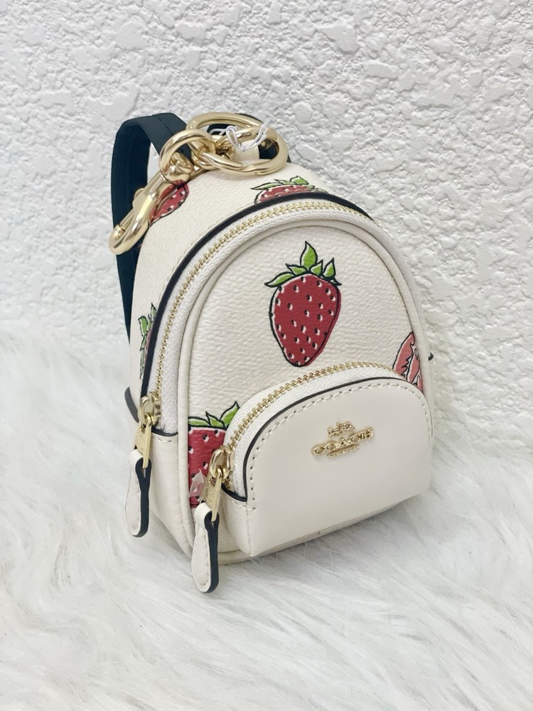 Coach CAO93 Mini Court Backpack Bag Charm With Strawberry Print 100% Authentic Color: Gold/Chalk Multi Brand new with tags Limited Edition SOLD OUT everywhere!! Style Number CAO93 Measurements Length: 1.5" Height: 3.25" Width: 4.0" Materials Printed coated canvas and smooth leather Fabric lining Features Outside zip pocket Zip closure Attached split key ring and dogleash clip Price is firm