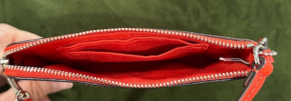 This wristlet is a must-have—sleek, functional, and eye-catching! The rich orange-red shade is gorgeous, and the pebbled leather feels luxe. It’s surprisingly roomy for its size, with a smooth zip closure and chic gold accents. Perfect for nights out or everyday use—holds cards, cash, and essentials without bulk. Coach quality shines through in every detail! Love how it elevates any look effortlessly.