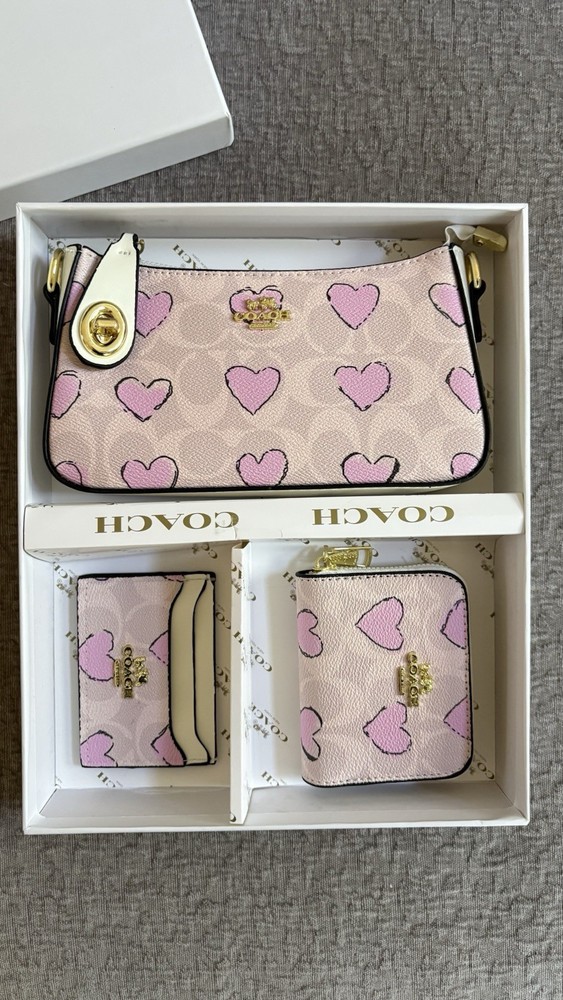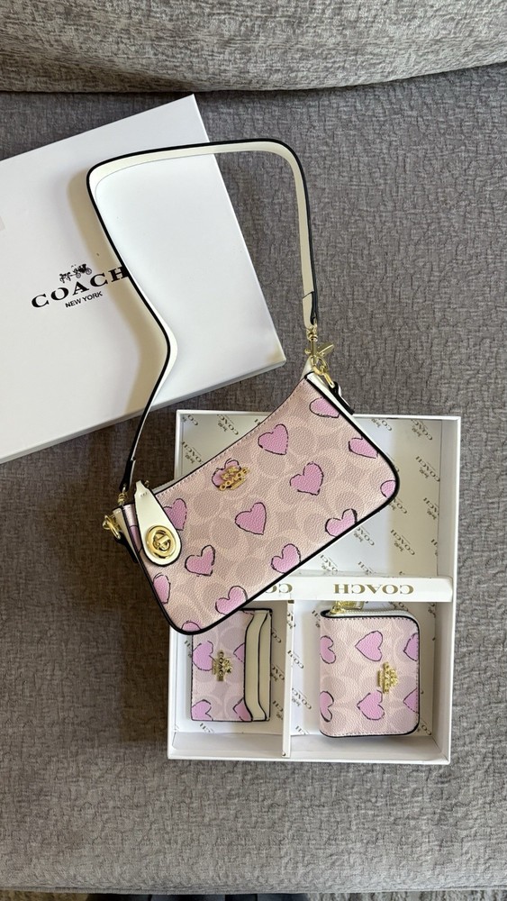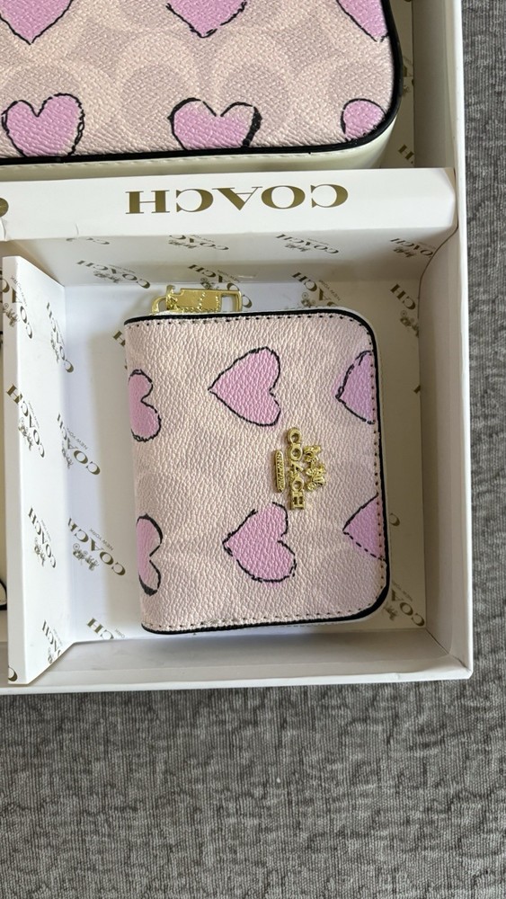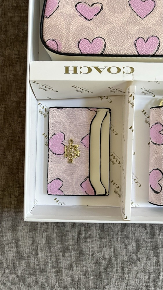 The Coach Pink With Heart Print Shoulder Bag is a stylish and feminine accessory for women. Made from leather with gold hardware accents, this small rectangular bag features a heart pattern design on the exterior. The zip closure and shoulder strap handle style make it easy to carry, while the inner pockets provide practical storage space. The included wallet and cardholder add extra functionality to this chic yet trendy handbag from Coach. ask any questions needed before buying !