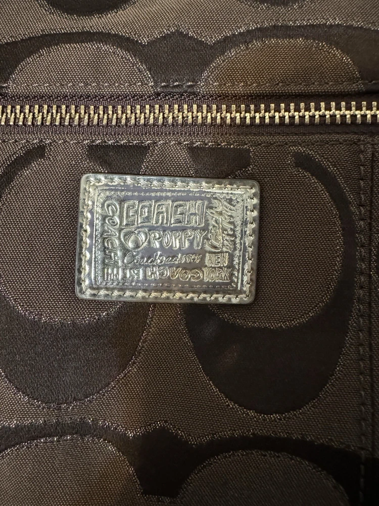 This Coach Poppy crossbody/handbag is a must-have for any fashion-forward woman. The metallic exterior material gives the bag a unique and stylish look, while the black and brown color combination adds a touch of classic elegance. The bag features a zip closure and a thin design, making it perfect for everyday use. With a size of 12 inches in width and 10 inches in height, this medium-sized bag is spacious enough to carry all your essentials. The bag also has a black lining color and features the Coach Poppy logo pattern, adding a designer, Y2K, and punk vibe to the overall look. The strap drop measures 7 and 23 inches, making it convenient to carry on your shoulder or across your body. This Coach Poppy crossbody/handbag is a perfect addition to any collection and is sure to make a statement wherever you go.