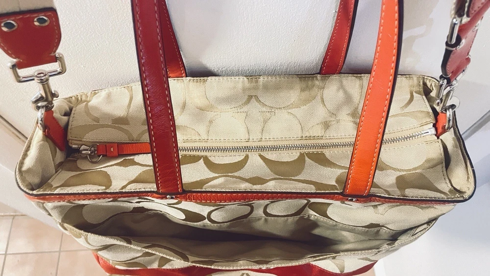 Like New and Excellent Condition! Coach Sateen shoulder bag is a stylish and versatile accessory for any woman. With a bright pink exterior and ivory lining, it features a zip closure and double handles with an 8-inch drop. The bag has a large size of 18 inches in width, 12 inches in height, and 6 inches in depth, making it perfect for travel, casual outings, or business meetings. Very clean inside and out. Used one time. No stains rips or tears. The bag also has a vintage feel with a logo pattern and silver and gold hardware. It includes several features such as a bottle pocket, inner pockets, and an adjustable strap. The nylon lining material and satin exterior material ensure durability and elegance. This Coach Sateen shoulder bag is a must-have for any fashion-conscious woman.