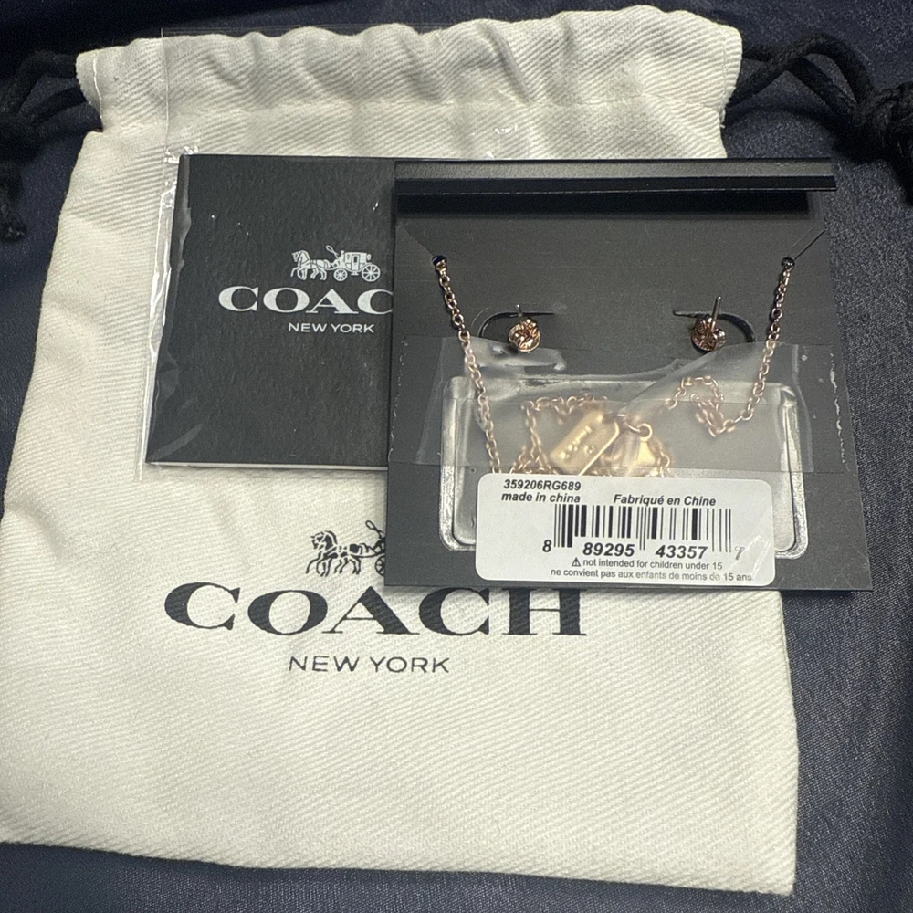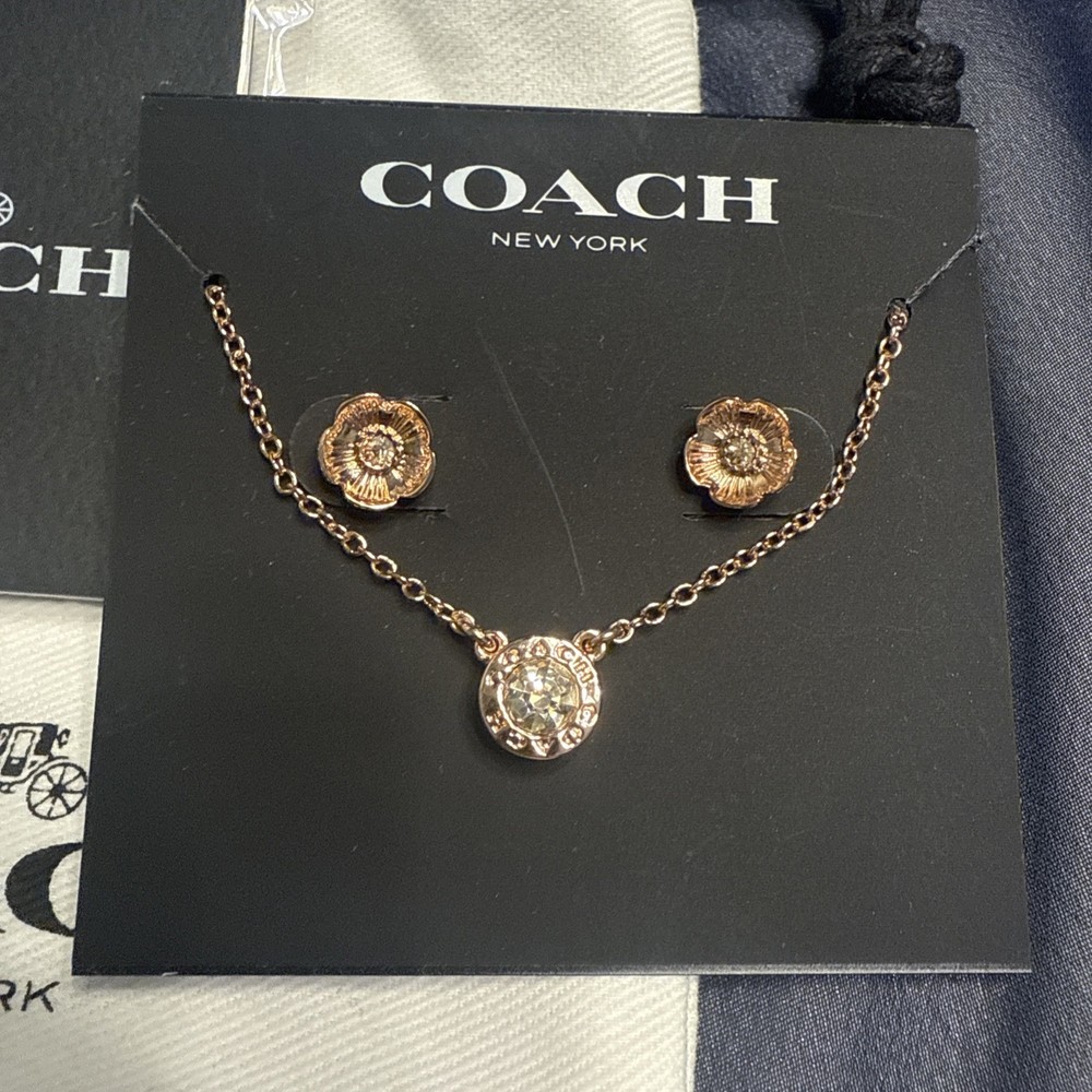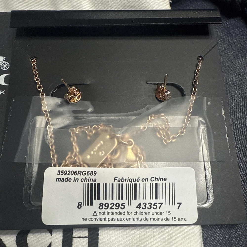 This Coach jewelry set includes an open circle necklace and tea rose stud earrings, all made of beautiful rose gold. The set also comes with a bag for easy storage and transportation. The necklace features an adjustable chain for a perfect fit, and both pieces are signed by Coach. The set is brand new with tags and was made in China.