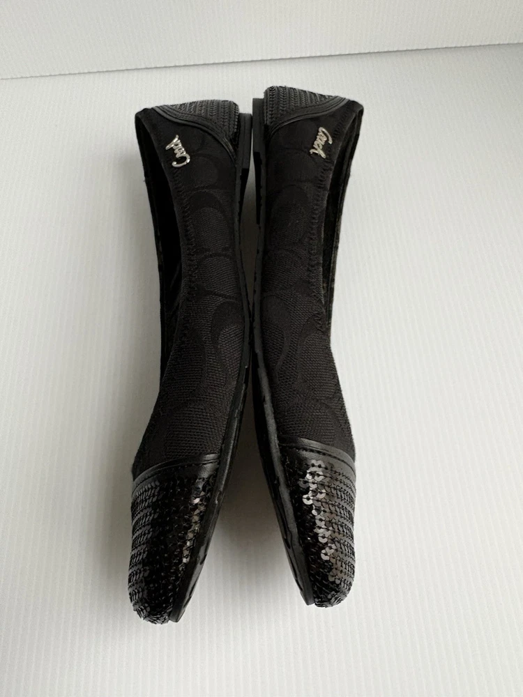 Coach Signature C Shine Ballet Flats. These shoes feature a black jacquard upper with the iconic Coach "C" signature pattern and a round sequin-detailed cap toe. Key Features Design: Round toe ballet flat with a shimmering sequined toe cap. Material: Jacquard fabric upper featuring the signature Coach "C" motif. Details: Gold-tone Coach signature branding is typically found on the side of the shoe. Sole: Built with a durable rubber outsole for traction. Excellent condition Size 9