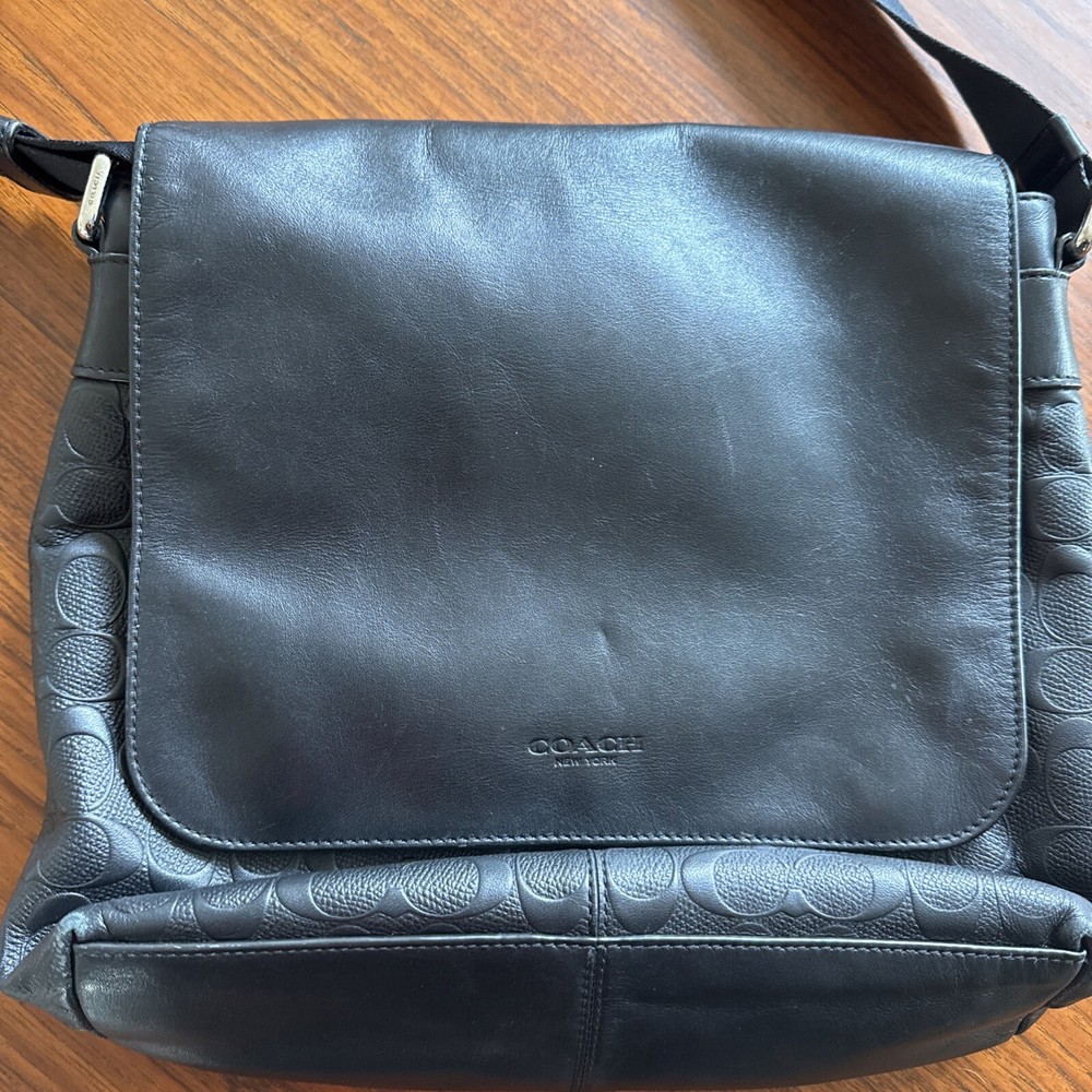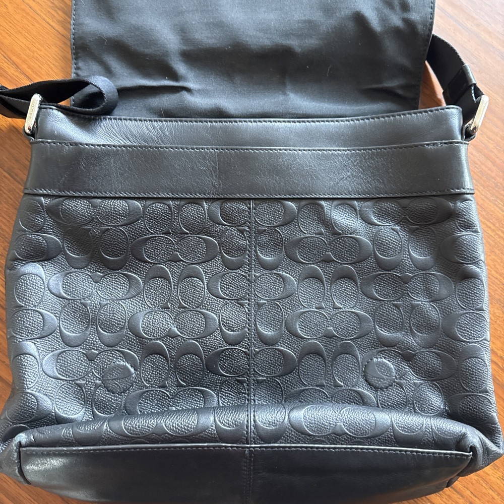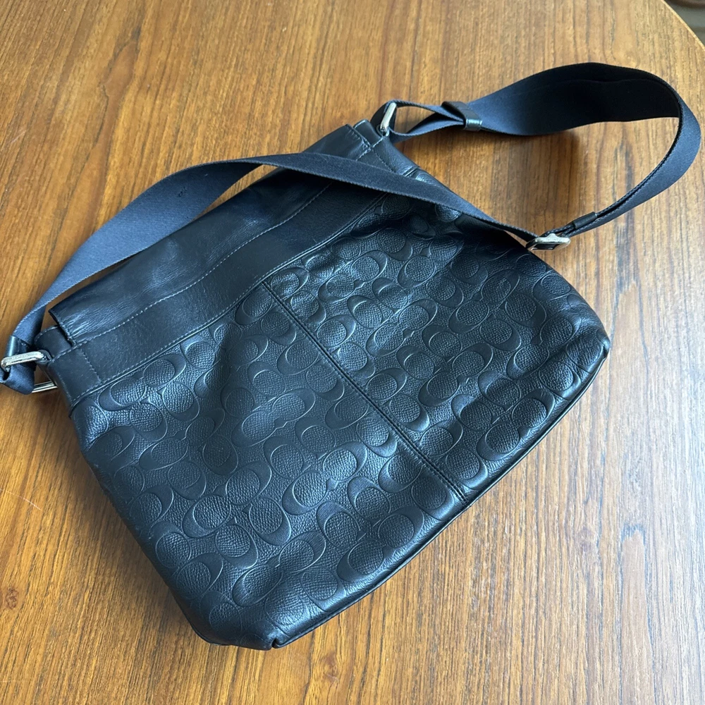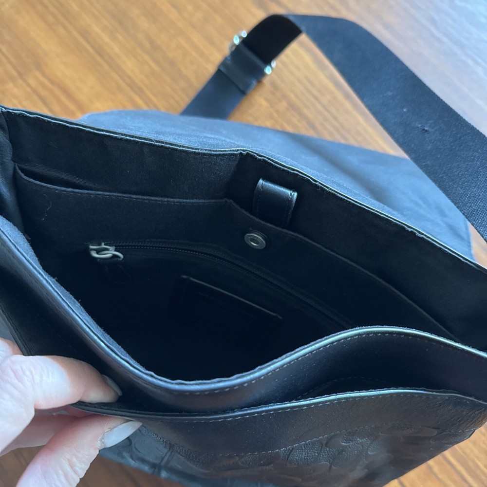 This Coach unisex crossbody bag is a stylish addition to any outfit. With a width of 13 inches, height of 12 inches, and depth of 4 inches, it is the perfect size for carrying all your essentials. The bag is made of high-quality leather and features a fabric lining. It has a classic black color with the Coach logo pattern, and comes with an adjustable strap made of polyester. The bag is designed with a cross-body strap for comfortable wearing, and has enough space to fit all your personal items. This Coach crossbody bag is a great choice for anyone looking for a stylish and functional accessory.