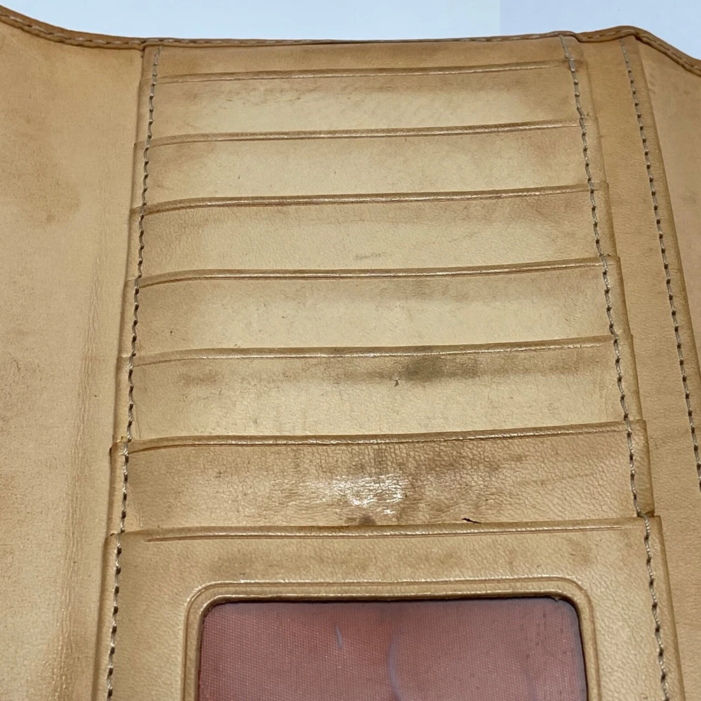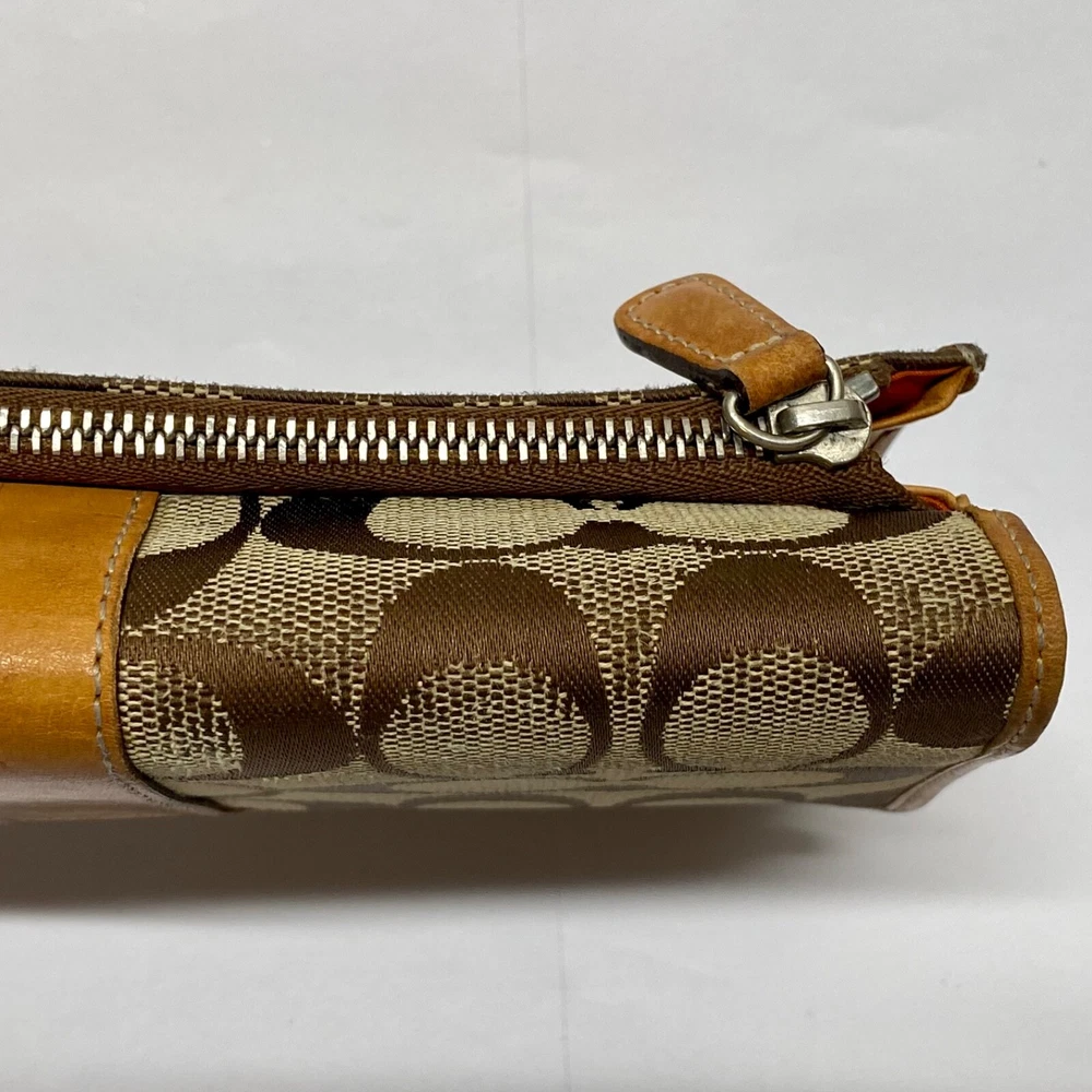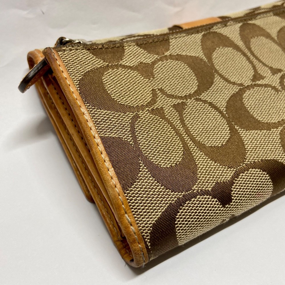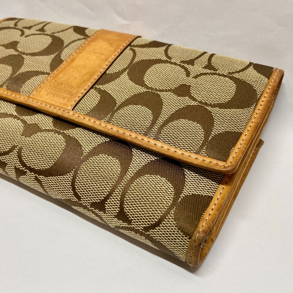 Coach Women's Signature Tri-fold Wallet Brown Khaki Jaquard Leather Trim Vintage This ladies snap front wallet is in good pre-owned condition with minimal signs of use. Please see all photos as this is the exact item you will receive. Please note there are some pen marks on the inside of wallet. Measurements are; 7.75" wide, 4.5" h and approximately 1" deep. Inside features 6 card slots, ID slot, and bill holder. Additional zip pocket on back of the wallet. Thanks for looking!