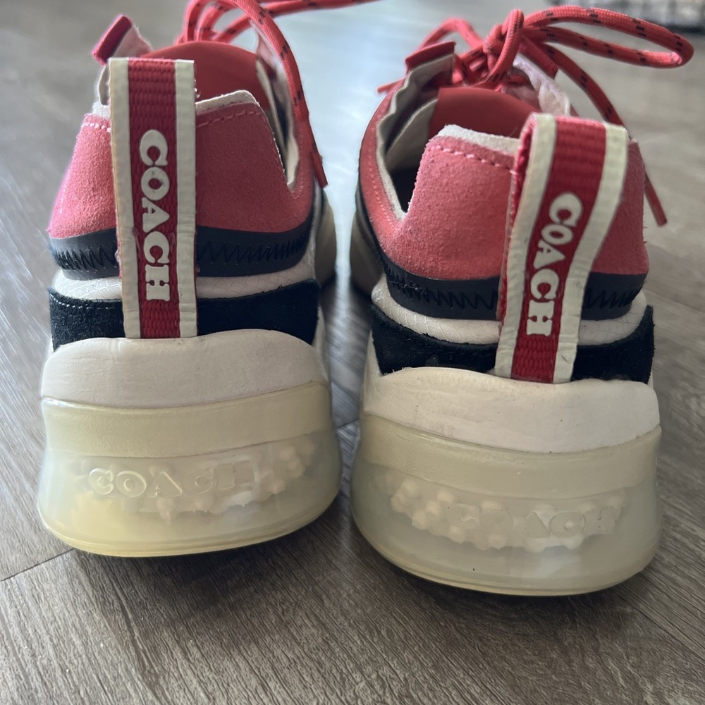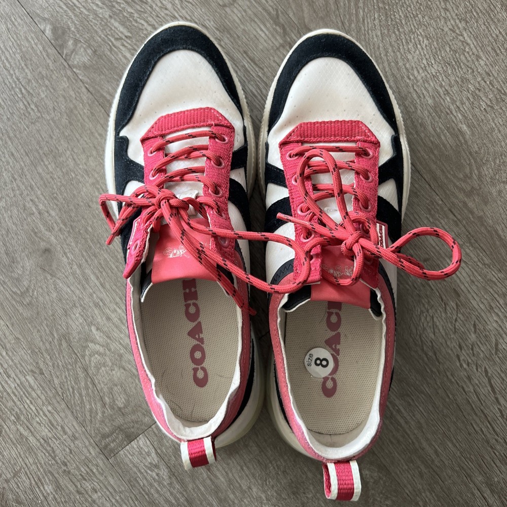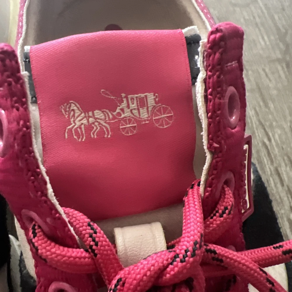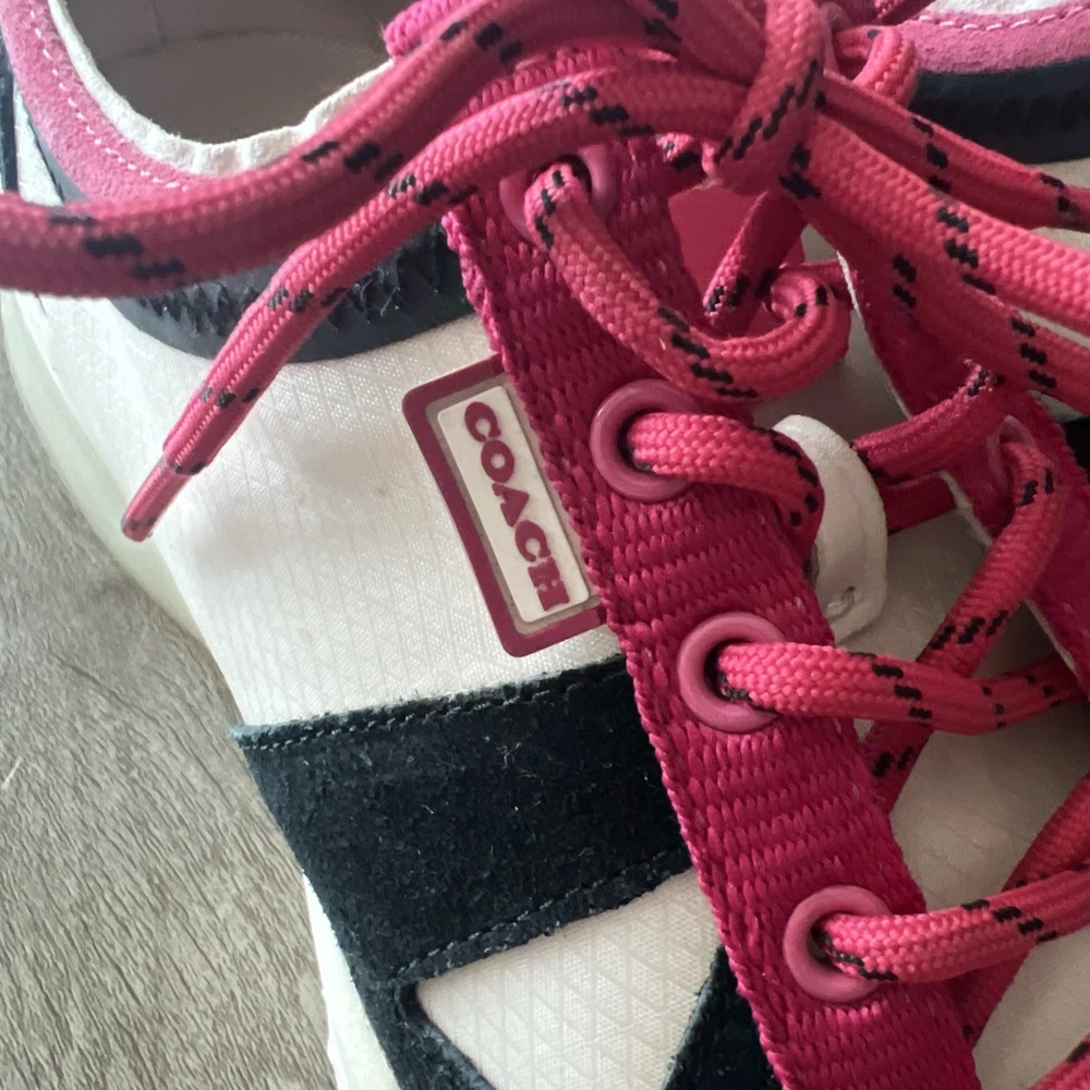 The Coach Women's Citysole Runner sneakers in black, milk, and deep pink are a stylish choice for active women. Featuring a lace-up closure and a lightweight, comfortable design, these sneakers are perfect for both casual wear and activewear. The geometric pattern with the Coach logo accents adds a fashionable touch, while the breathable suede lining and polyurethane outsole provide comfort and durability. Whether you're jogging or just running errands, these sneakers are a trendy option for the modern woman.