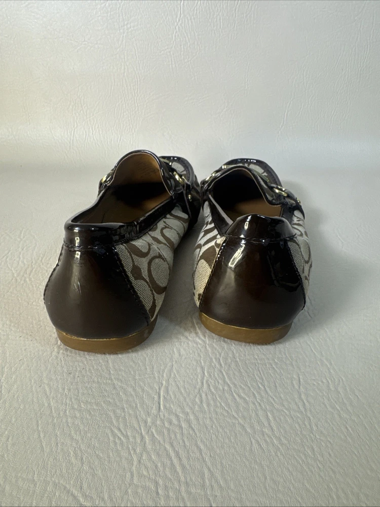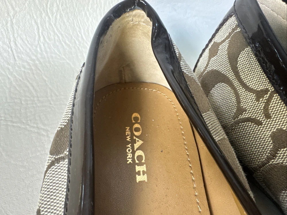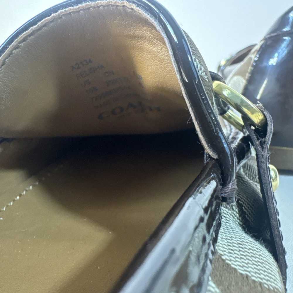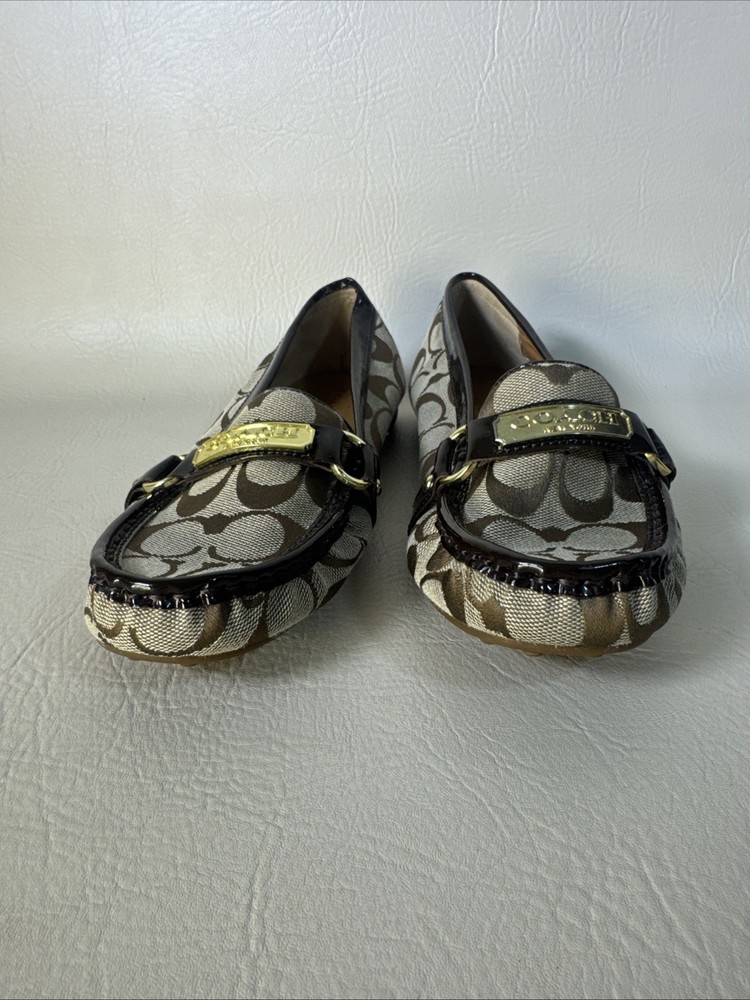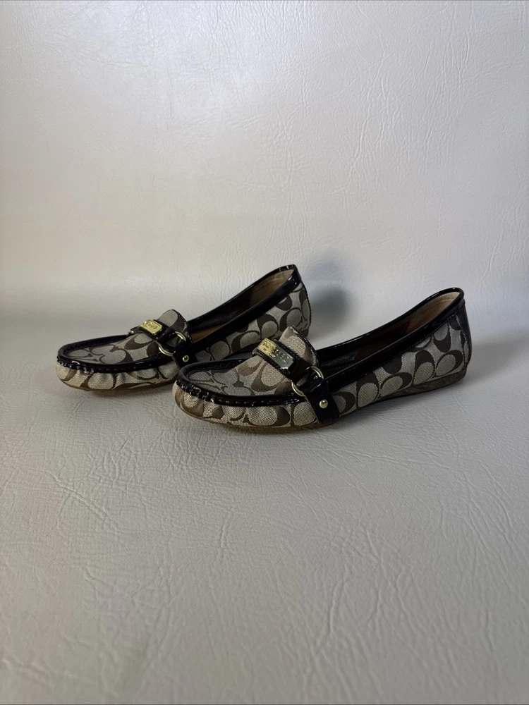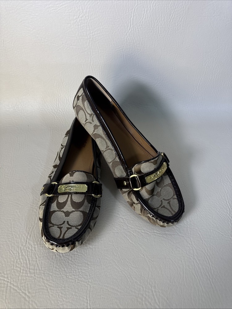 The Coach Women's Loafers Felisha A2134 in size 10B are a stylish and comfortable option for women looking for a flat shoe. Made with mixed materials, these brown loafers feature the signature Coach branding and are designed in a classic loafer style. Perfect for everyday wear or dressing up an outfit, these loafers are a versatile and fashionable choice for any woman's wardrobe. Pre-owned without original box. Hardly used. No damages. Please check the pictures carefully as part of the description. Feel free to ask questions if you need more information before you buy it. Thank you for your interest D-15