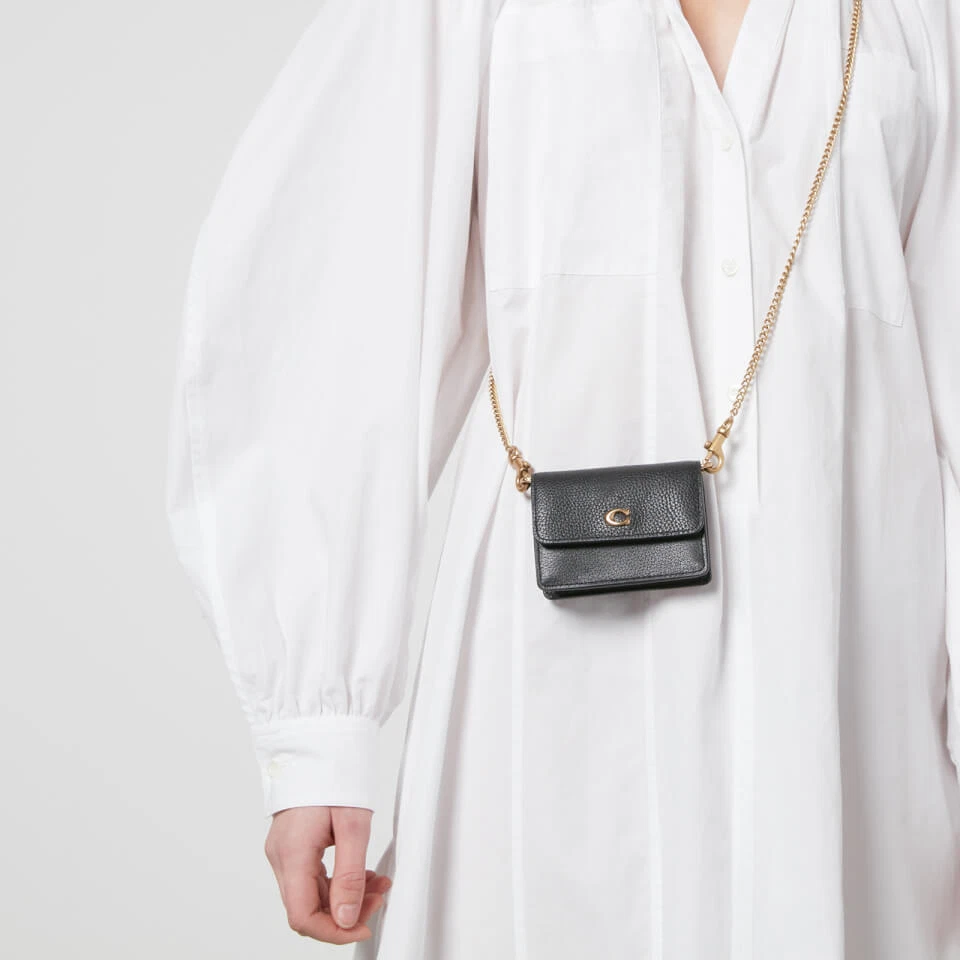 Department: Women Strap Drop: 21 in Handle/Strap Material: Stainless Steel Features: Credit Card Slot, Outer Pockets, Chain Detachable Strap Hardware Color: Yellow Gold gtin13: 195031396939 Brand: Coach Product Line: Coach Card Case Handle Style: Crossbody Strap Bag Height: 3 in Model: Coach Half Flap Card Case Character: Pebbles Bag Depth: 1 in Closure: Snap Finish: Pebbled Bag Width: 4 in MPN: C6718 Exterior Color: Black Size: Mini Hardware Material: Brass Exterior Material: Leather Style: Crossbody/Shoulder Bag UPC: 195031396939