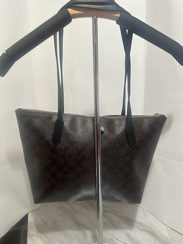 This Coach zip top tote purse is a stylish and spacious accessory perfect for any woman on the go. Made from luxurious brown leather with gold hardware accents, this large tote features a convenient zip closure and inner pockets for organization. The fabric lining adds a touch of luxury to this designer handbag, making it a versatile and chic choice for any outfit. Perfect for carrying essentials in style, this Coach purse is a timeless addition to any wardrobe.