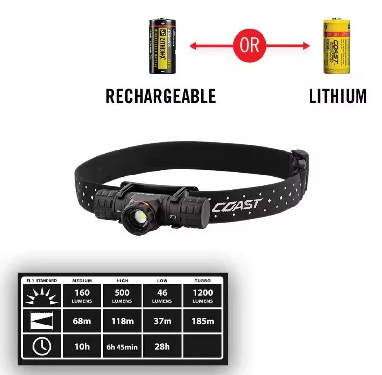 - NOTE: PLEASE READ PRODUCT DESCRIPTION CAREFULLY BEFORE PURCHASING. - NOTE: NO DELIVERY TO FREIGHT FORWARDING COMPANY ADDRESSES AND WAREHOUSE, BUSINESS ADDRESS, THE UPS STORE, UNITED STATES POSTAL SERVICE. - NOTE: WE DO NOT WORK ON SATURDAY AND SUNDAY. YOUR ORDER IS PROCESSED IN A MAXIMUM OF 10 BUSINESS DAYS, EXCLUDING SATURDAYS AND SUNDAYS. - NOTE: ORDERS TAKE A LONG TIME TO PROCESS, IF YOU CAN'T WAIT, YOU CAN SUBMIT A CANCELLATION REQUEST AT ANY TIME WHILE THE ORDER HAS NOT BEEN SHIPPED. - NOTE: DO NOT BUY MULTIPLE PRODUCTS IN THE SAME ORDER. PLEASE BUY EACH PRODUCT AS ONE ORDER. Coast XPH30R 1200 Lumen Rechargeable Dual Power Magnetic LED Headlamp About This Product Work with dynamic hands-free lighting-the full-featured Coast XPH30R rechargeable Dual Power headlamp shines bright with versatile power. Work hands-free with light right where you need it. The Coast XPH30R rechargeable Dual Power headlamp features a stormproof and dust-resistant aluminum body that rolls in its bracket for dynamic directional lighting. Patented PURE BEAM focusing technology delivers variable lighting with seamless transitions between flood beam and spot beam, plus 4 output options: medium, high, low, and Coast's mega-bright Turbo Mode. Designed to solve lighting challenges from any angle, the headlamp body also easily detaches from the head strap and mounting bracket to become a versatile handheld flashlight with a built-in magnetic base for attachment to metallic surfaces. A Coast ZITHION-X rechargeable battery powers the headlamp right out of the package, but it can also run on 2 CR123 lithium batteries if preferred. Accurately monitor power status with the battery life indicator, and recharge as needed using the built-in ProTek charging port. Highlights PURE BEAM focusing optic: focus the PURE BEAM optic just how you need it-flood beam or spot beam-available in 4 output modes: medium, high, low, and Coast's super-lumens turbo mode Dual Power system: power up on your terms with Dual Power technology that enables the headlamp to run on Coast ZITHION-X rechargeable batteries or 2 CR123 lithium batteries Battery life indicator: stay prepared, plan your power-the battery life indicator on the power button makes it easy to monitor when you need to recharge PRO-TEK charging port: charge the battery inside the light using the built-in ProTek charging port and battery charging indicator USB-C charging: recharge with the type C USB charging cable included in the package Magnetic base: work hands-free with a variable-direction headlamp that also detaches to become a flashlight with a magnetic base IP54 weather rating: rely on world-class design and tough construction in an aluminum headlamp rated IP54 dust-resistant and weather-proof